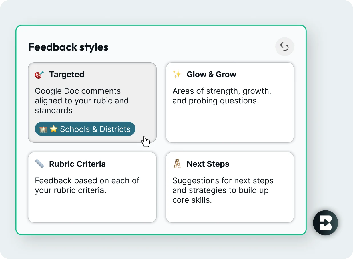 Offer students personalized, targeted feedback in Google Docs, guiding them precisely where to revise. Feedback appears as Google comments and can be aligned to your rubric and standards.