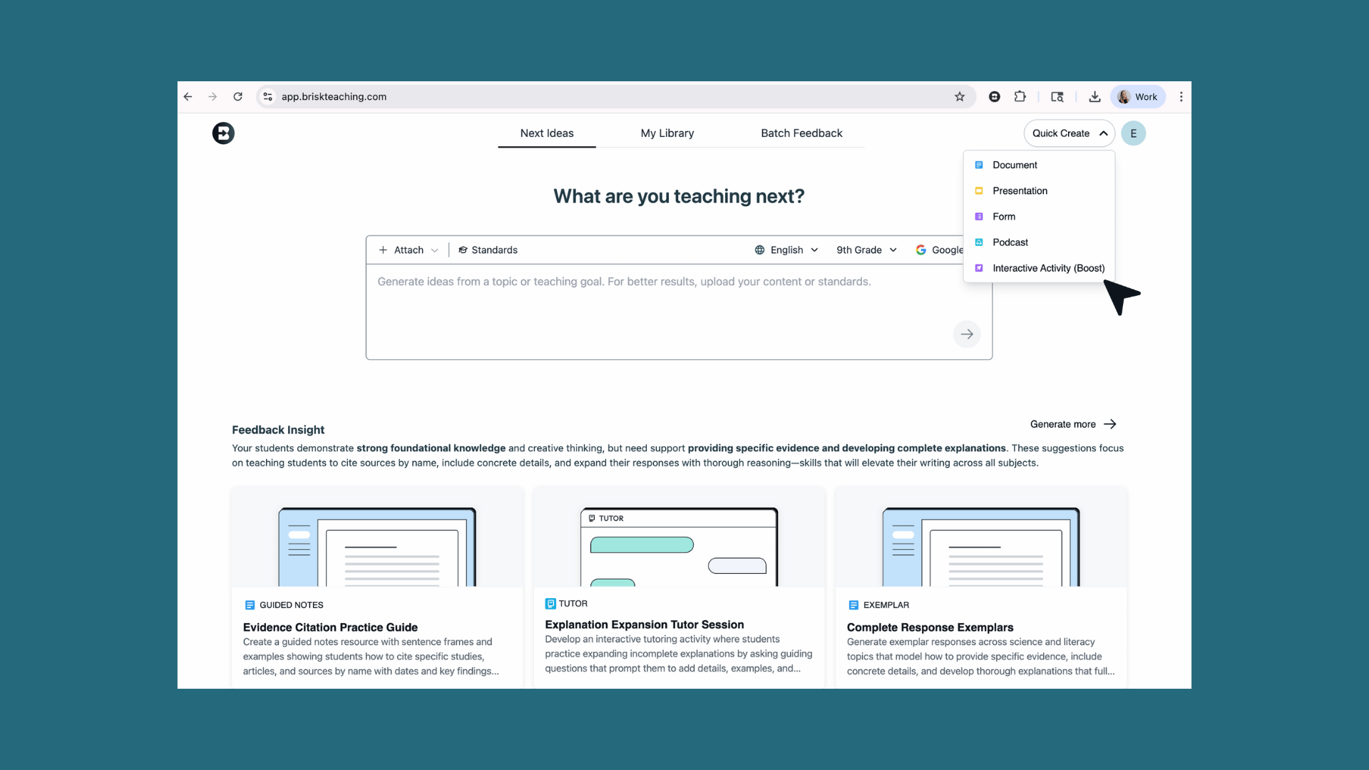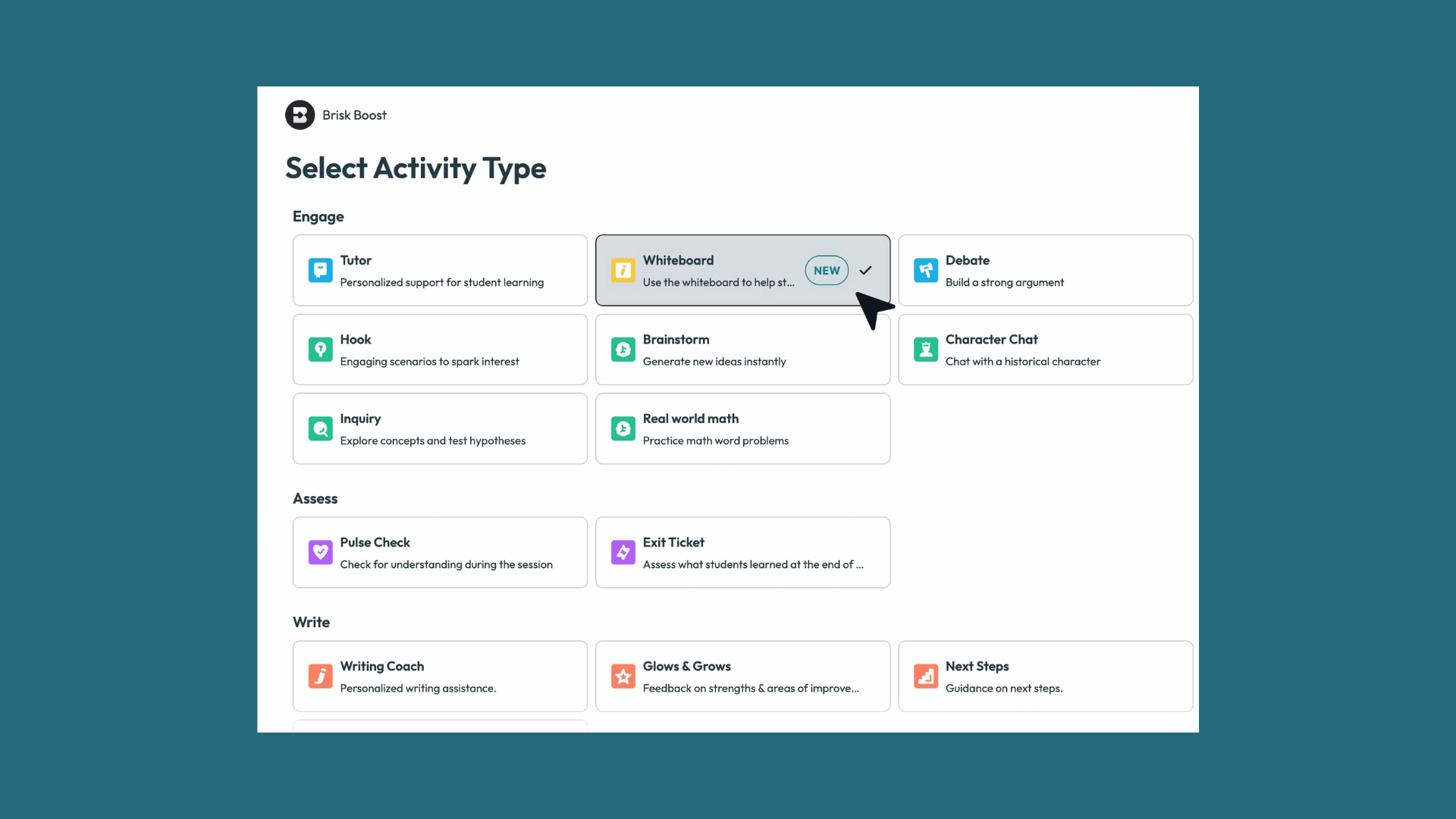 - Choose Whiteboard: Select Whiteboard, enter your prompt, and set grade level, standards, and language.