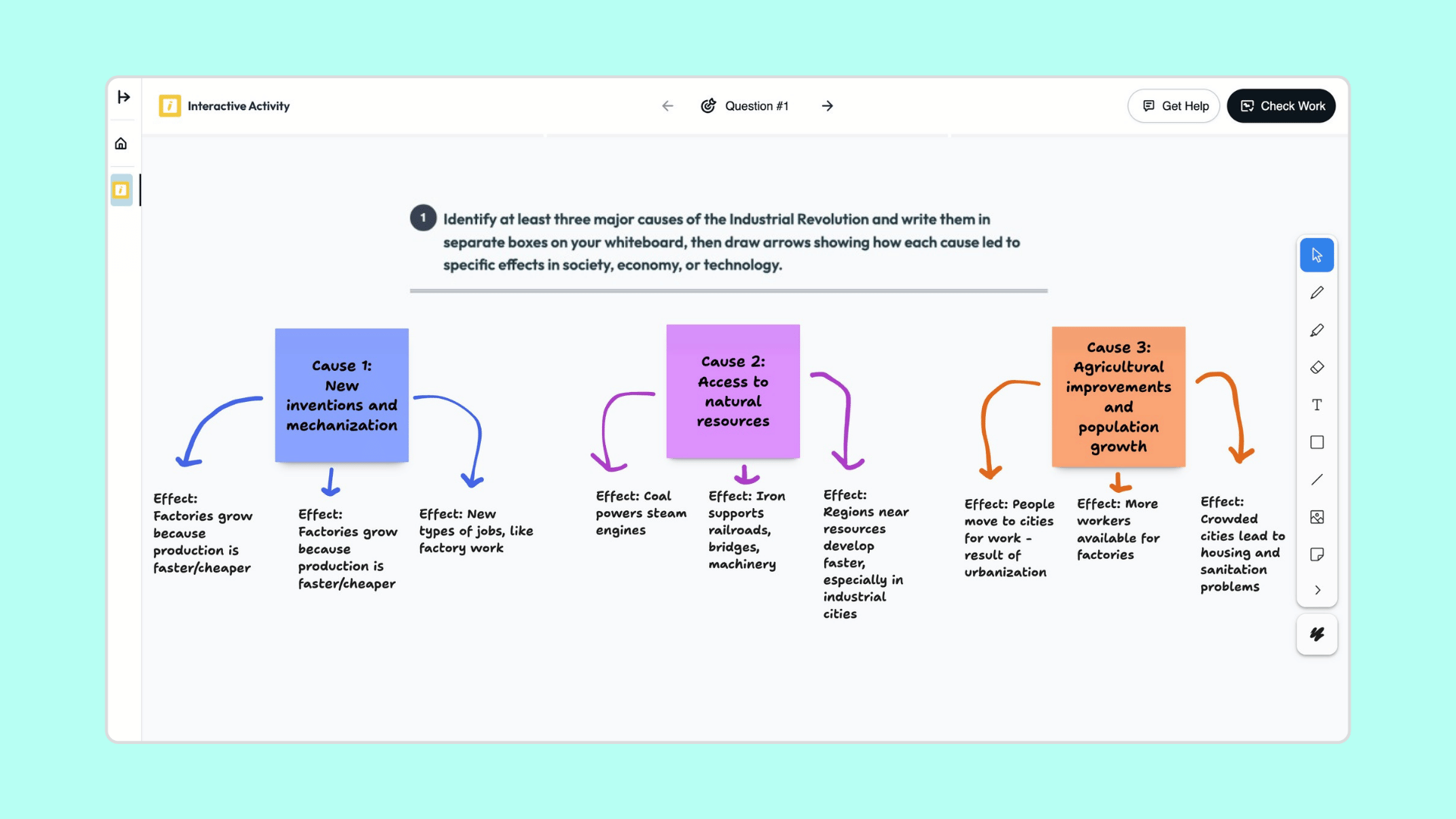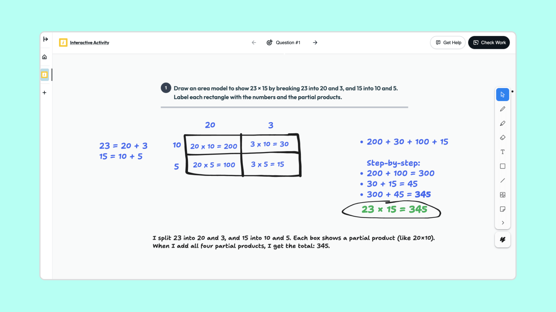 Students sketch, label, and explain directly on the whiteboard, making their reasoning easier to understand so you can guide learning in the moment.