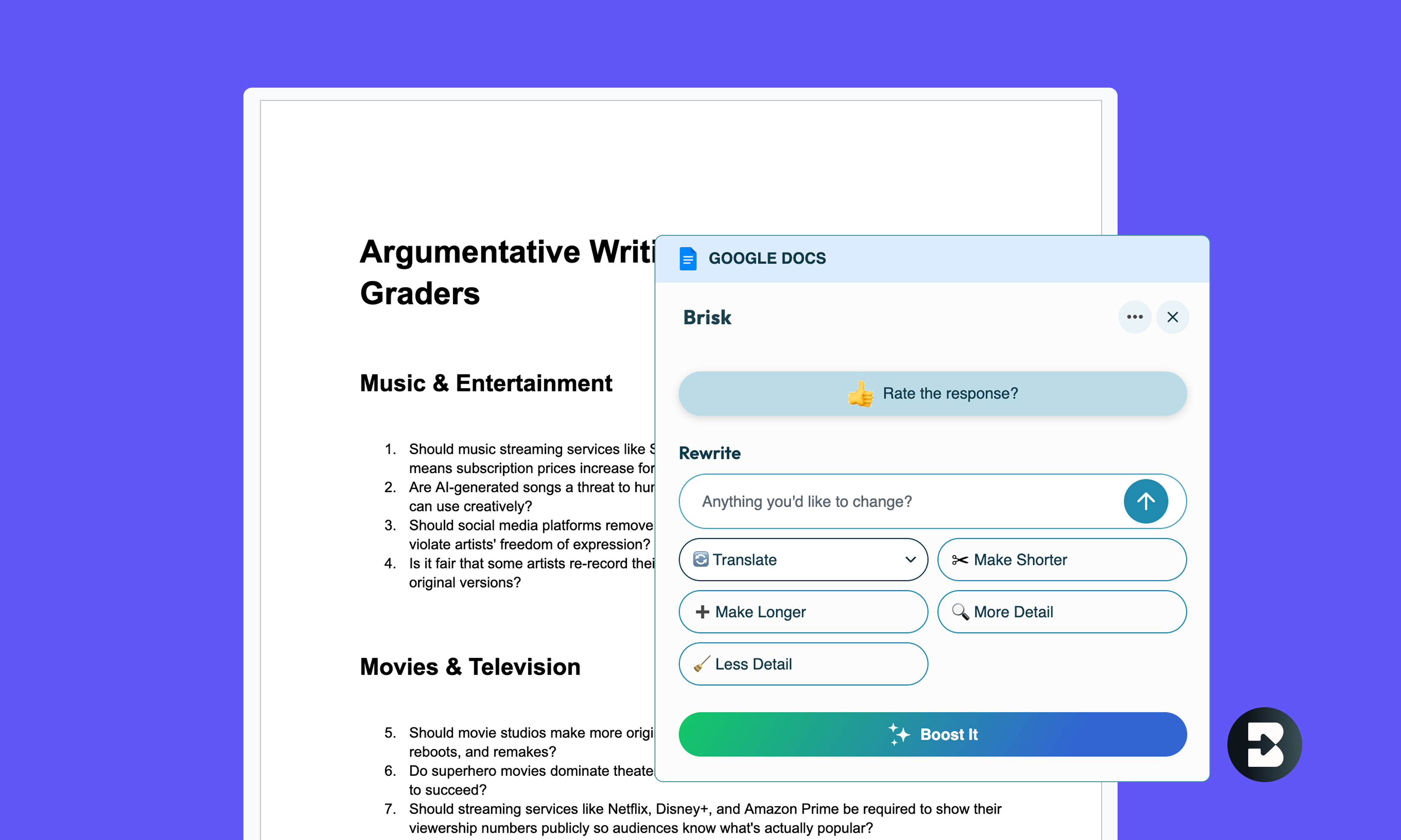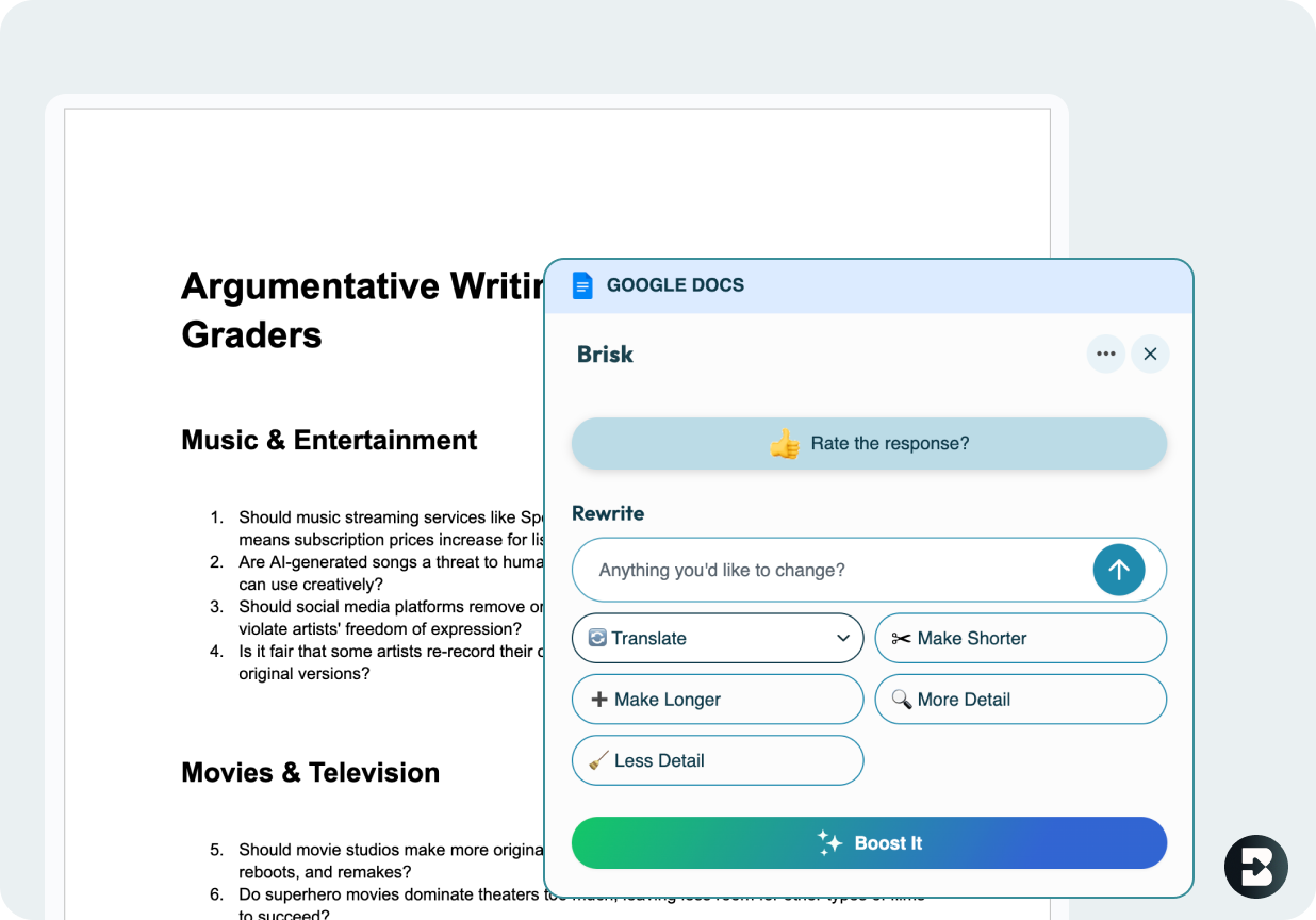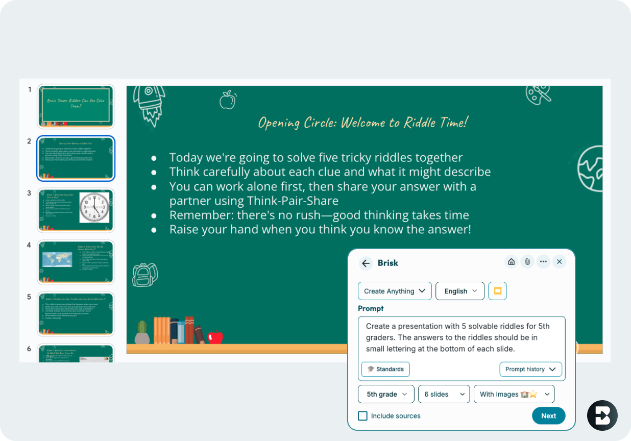 Every resource is tailored to meet your teaching goals. If Brisk's first creation isn't quite what you wanted, Brisk offers options to refine your output until it's perfect.