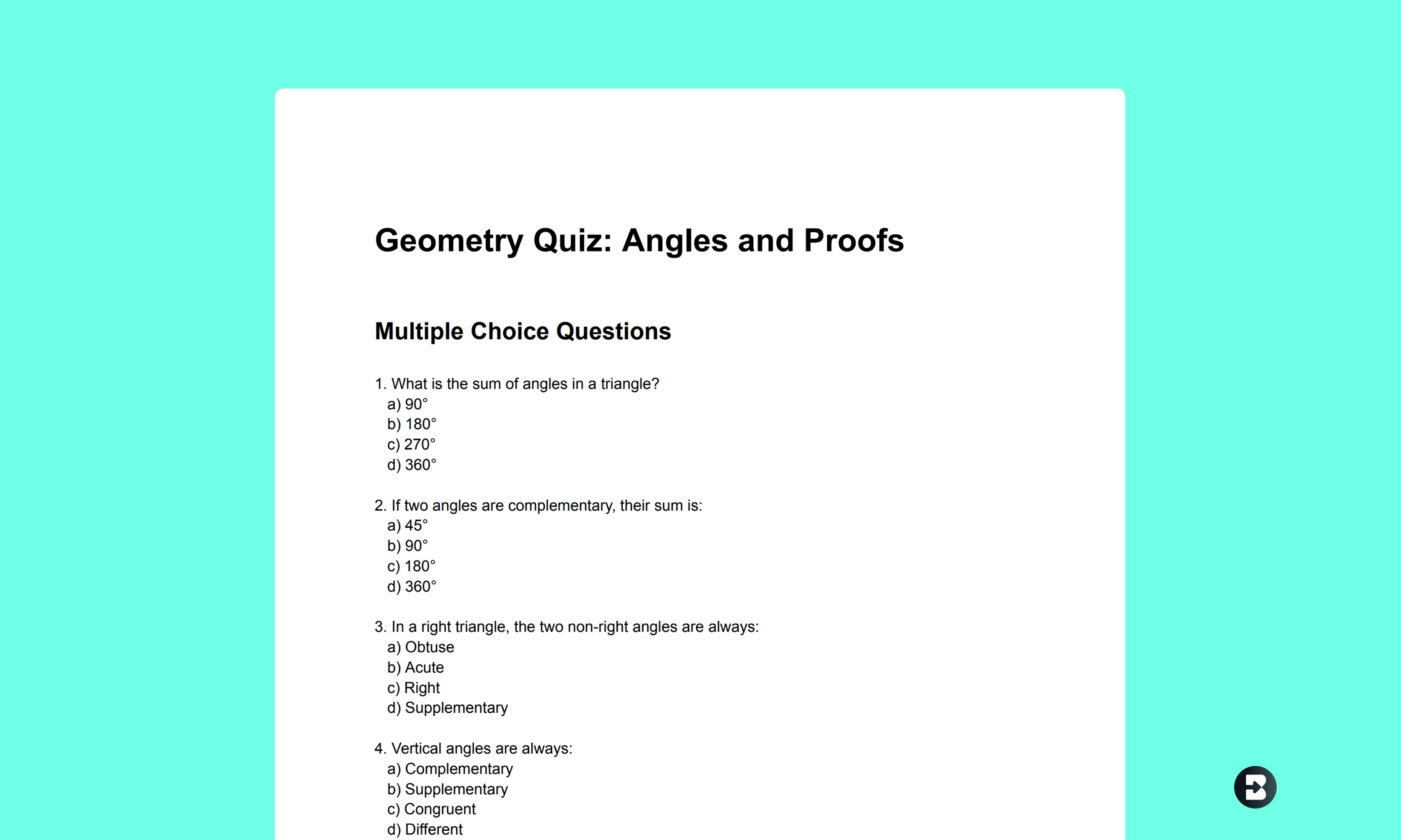 Create a quiz to evaluate student understanding of core geometry concepts, complete with varied question formats.