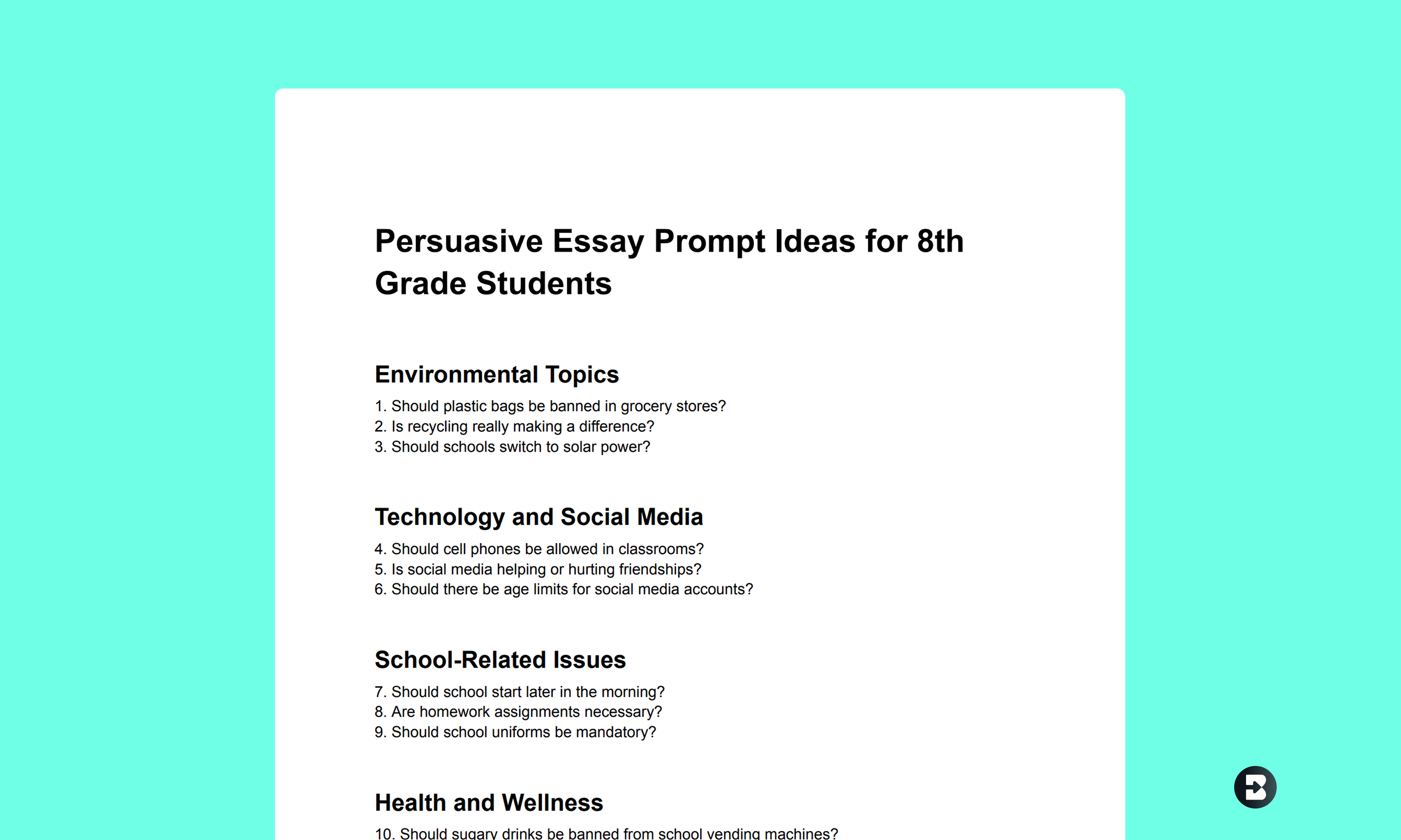 Create a series of engaging persuasive essay prompts for your middle schoolers on a variety of topics that will motivate them to write.