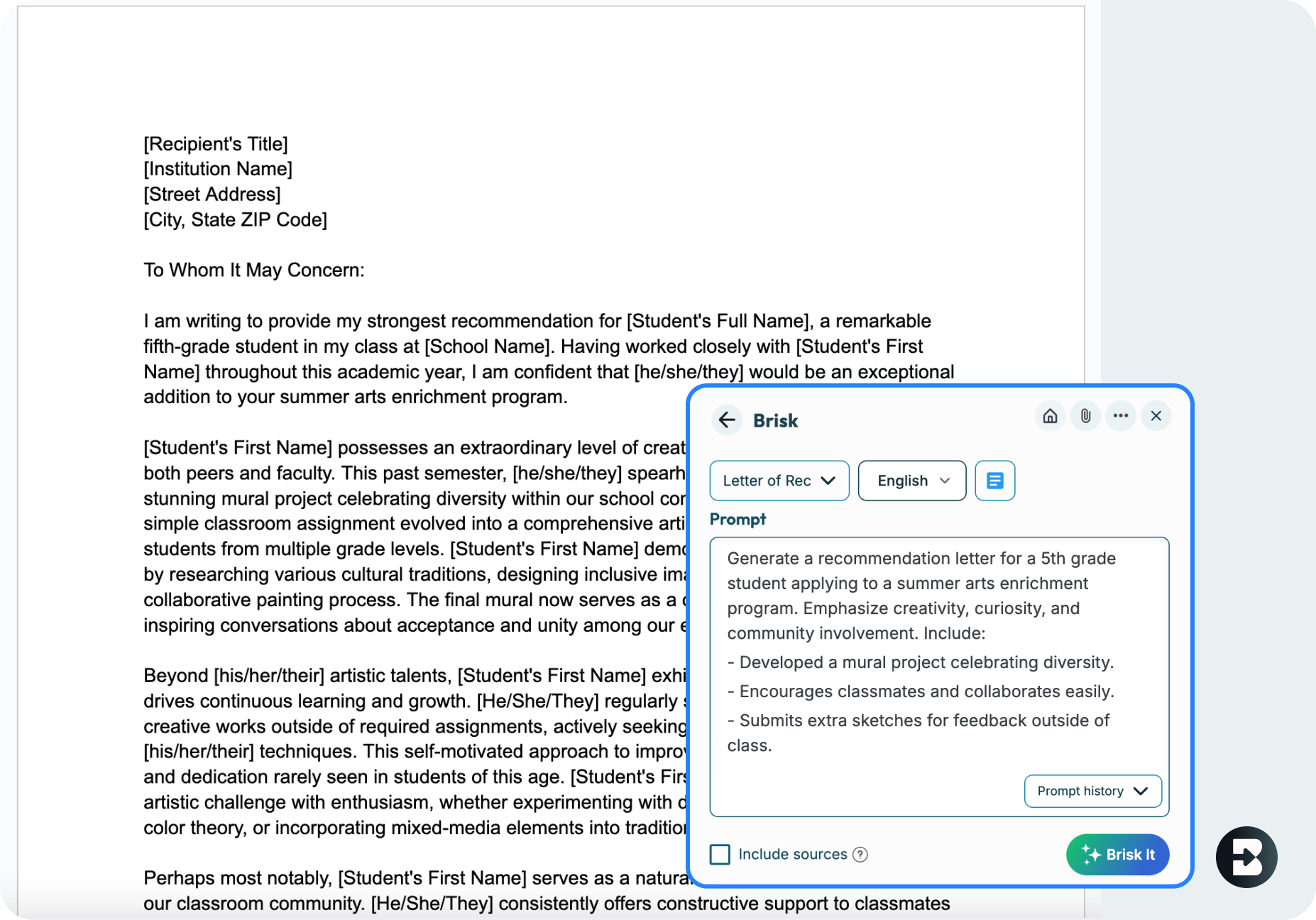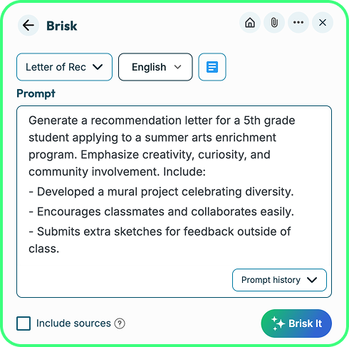 Brisk helps you write authentic recommendations in minutes — so you can celebrate your students’ achievements without the time crunch. Get started with Brisk and make letter writing effortless.