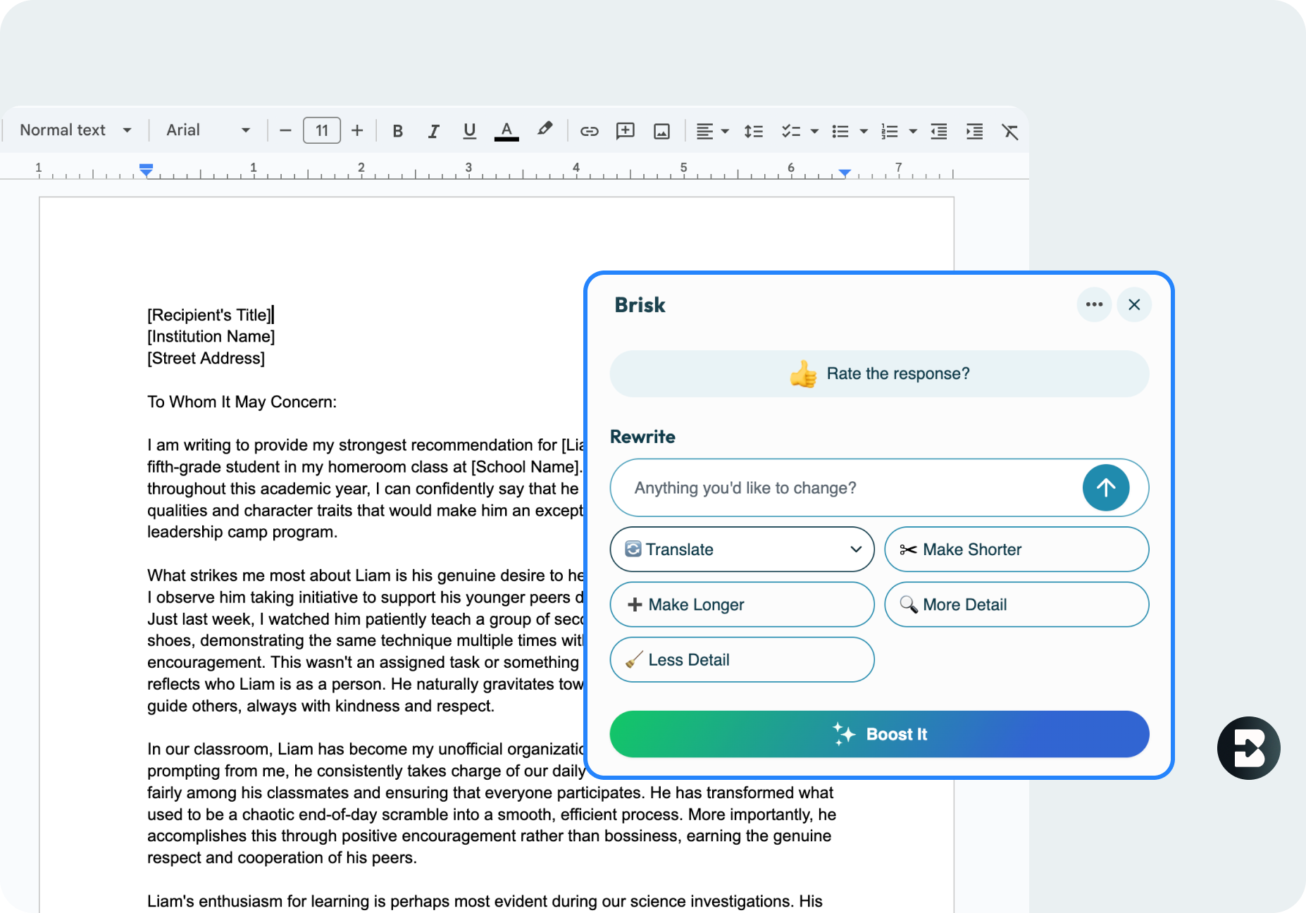 Brisk’s AI mirrors your tone and phrasing to create authentic, human-sounding recommendations. No generic templates — just letters that reflect how you’d naturally write about your students.