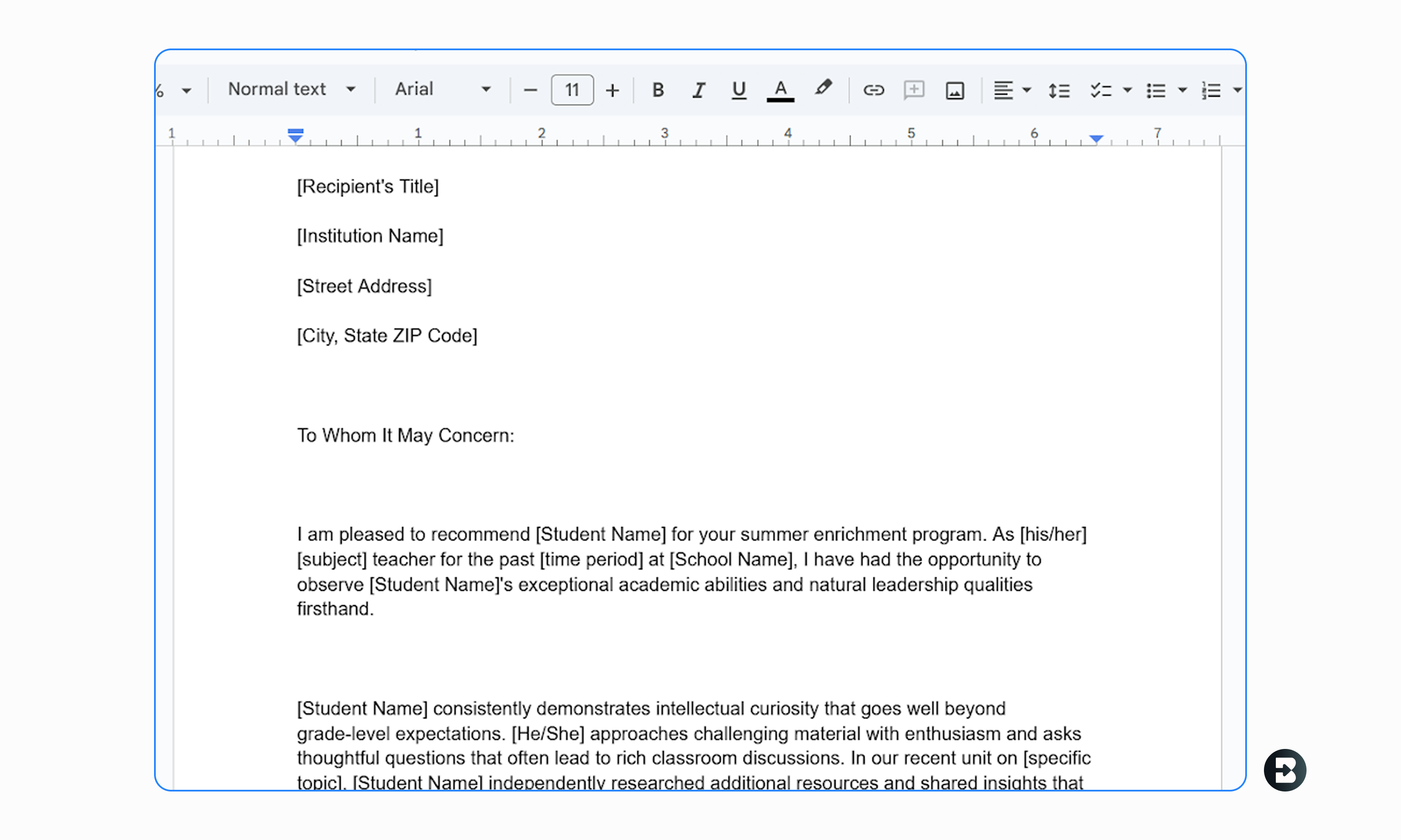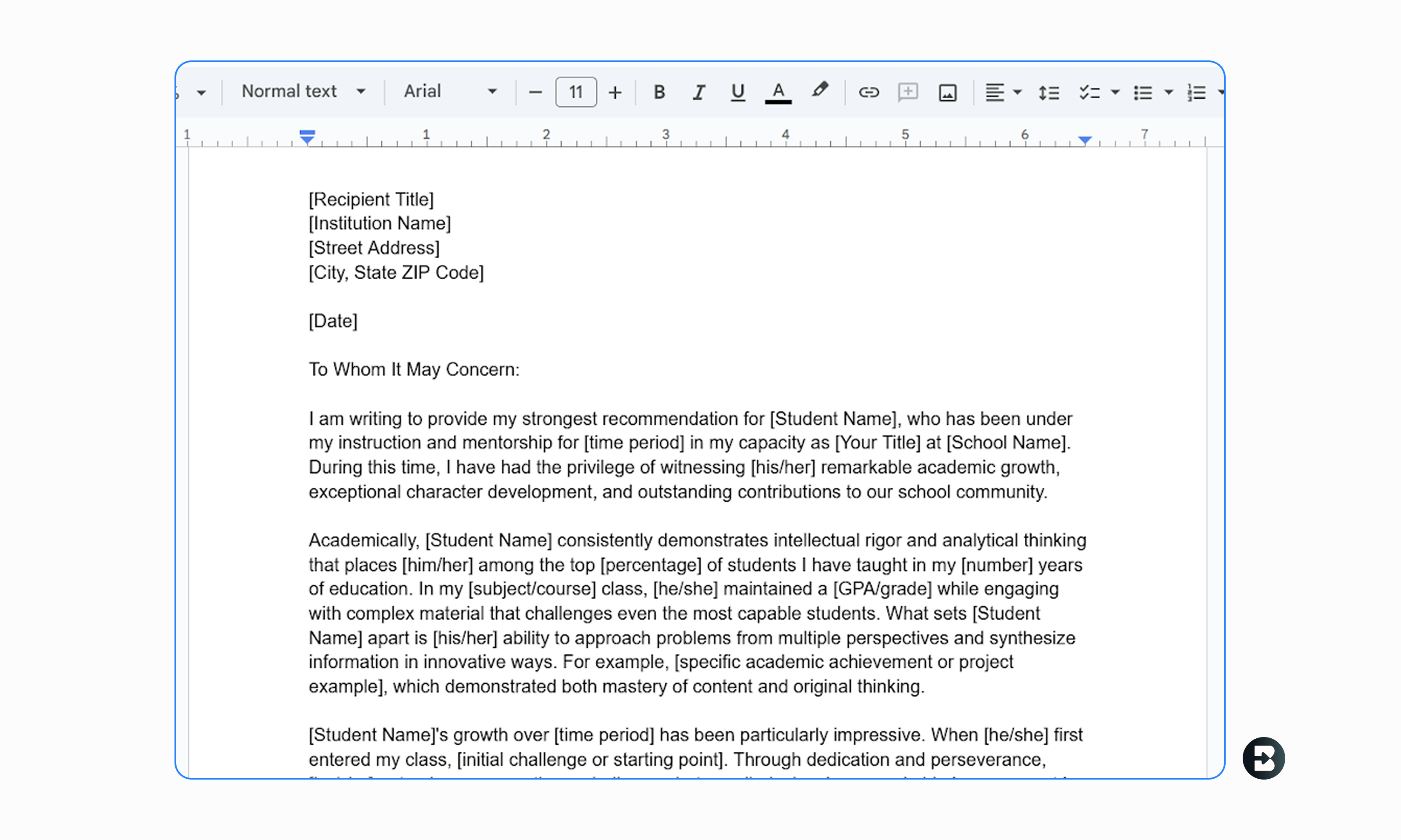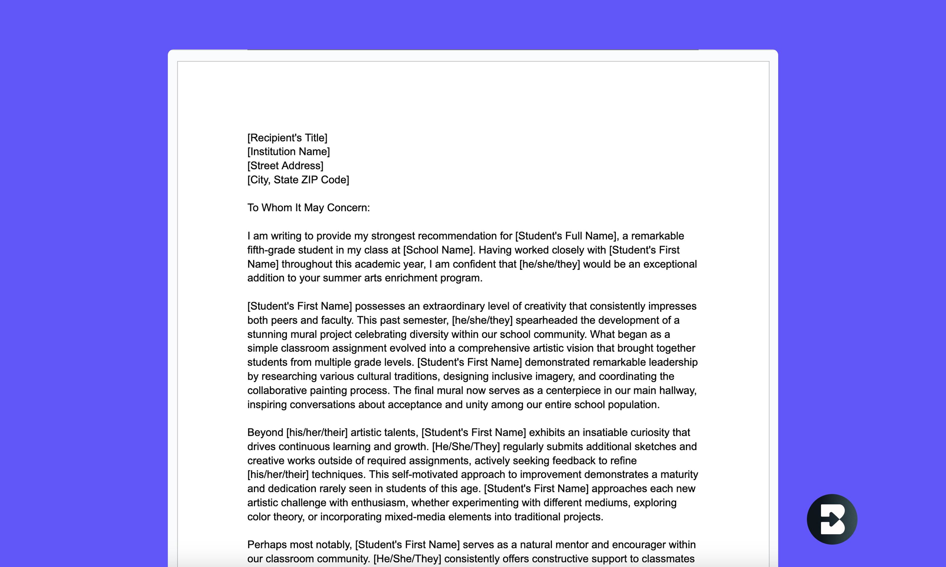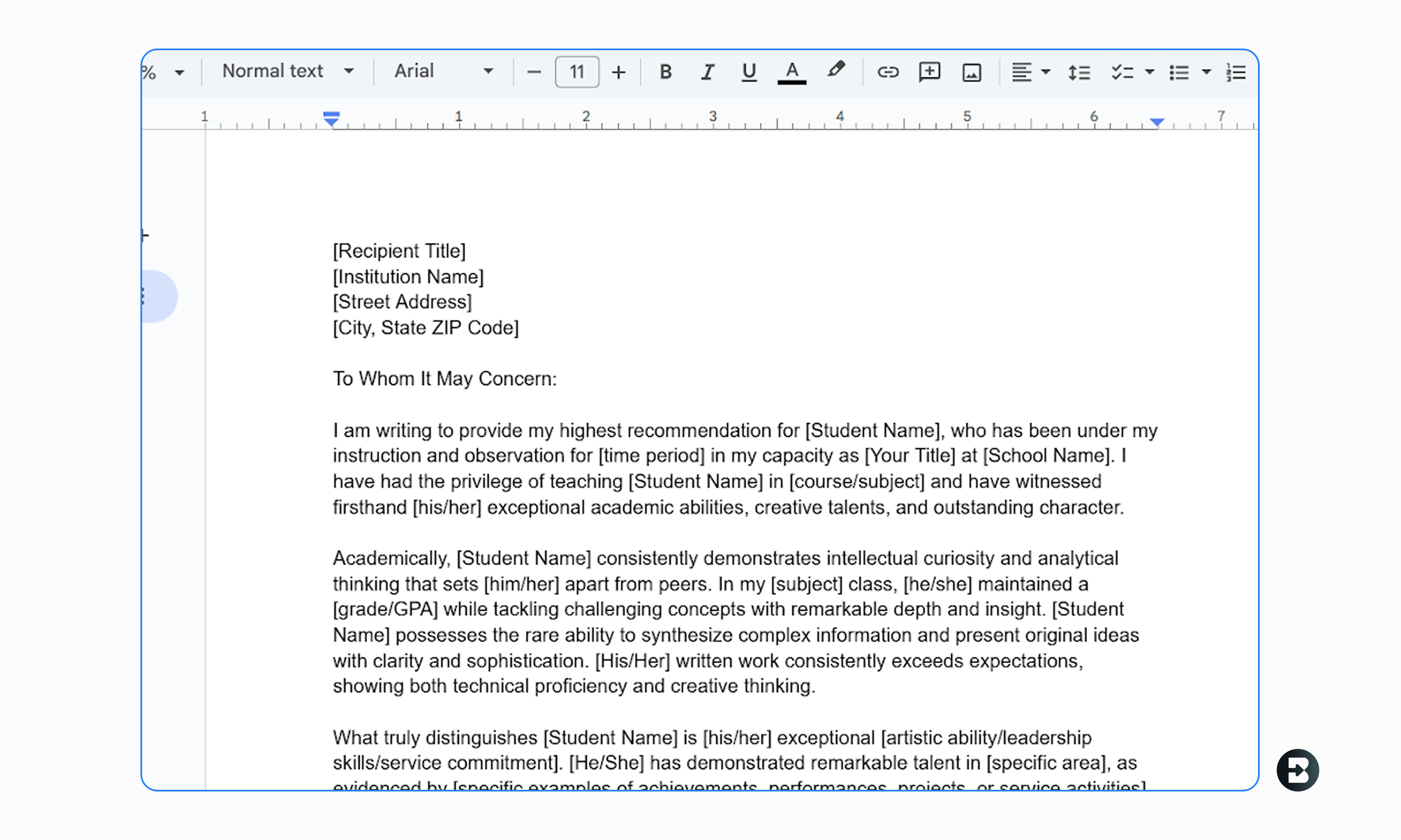 Each letter follows a clear, professional format that admissions and scholarship committees expect, so you can focus on meaningful details while Brisk handles the framework.