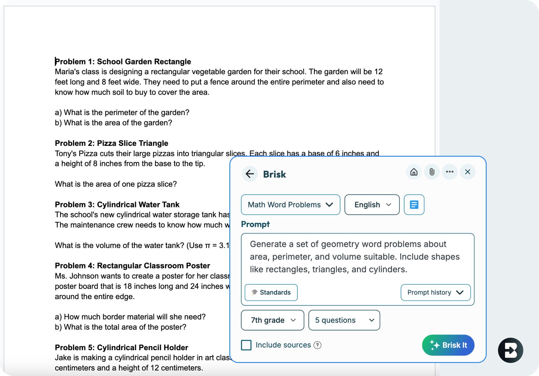 Use Brisk’s AI Math Problem Generator to create math resources that help your students learn, without spending hours making them.