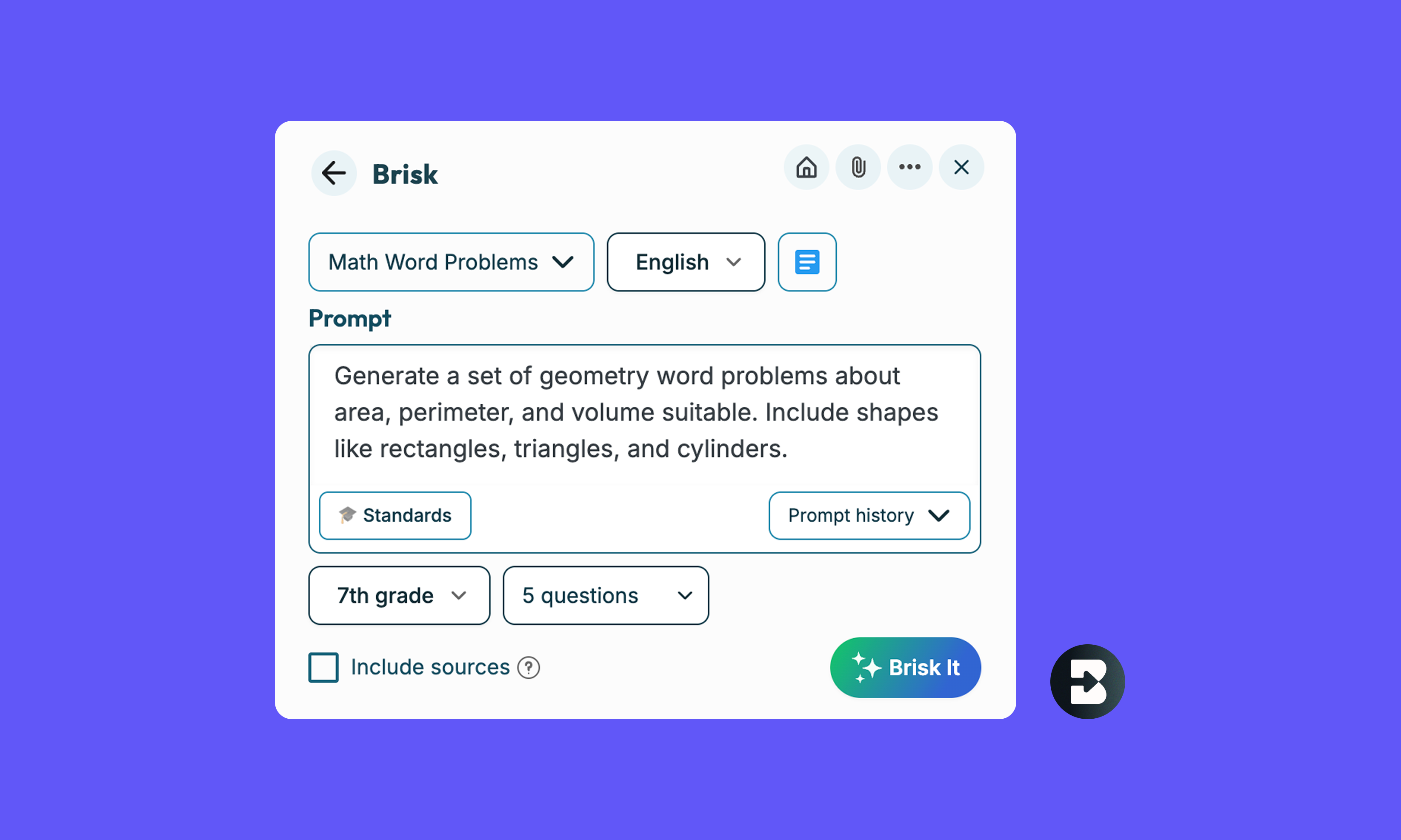From fractions to algebra, word problems to geometry, Brisk builds question sets that fit your curriculum and student goals—no templates or tedious formatting needed.