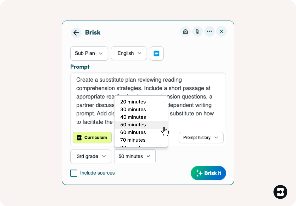 Set exactly how long the lesson should be. Choose your grade level, align to standards if needed, and Brisk creates a plan that fits perfectly — with clear instructions for any substitute.