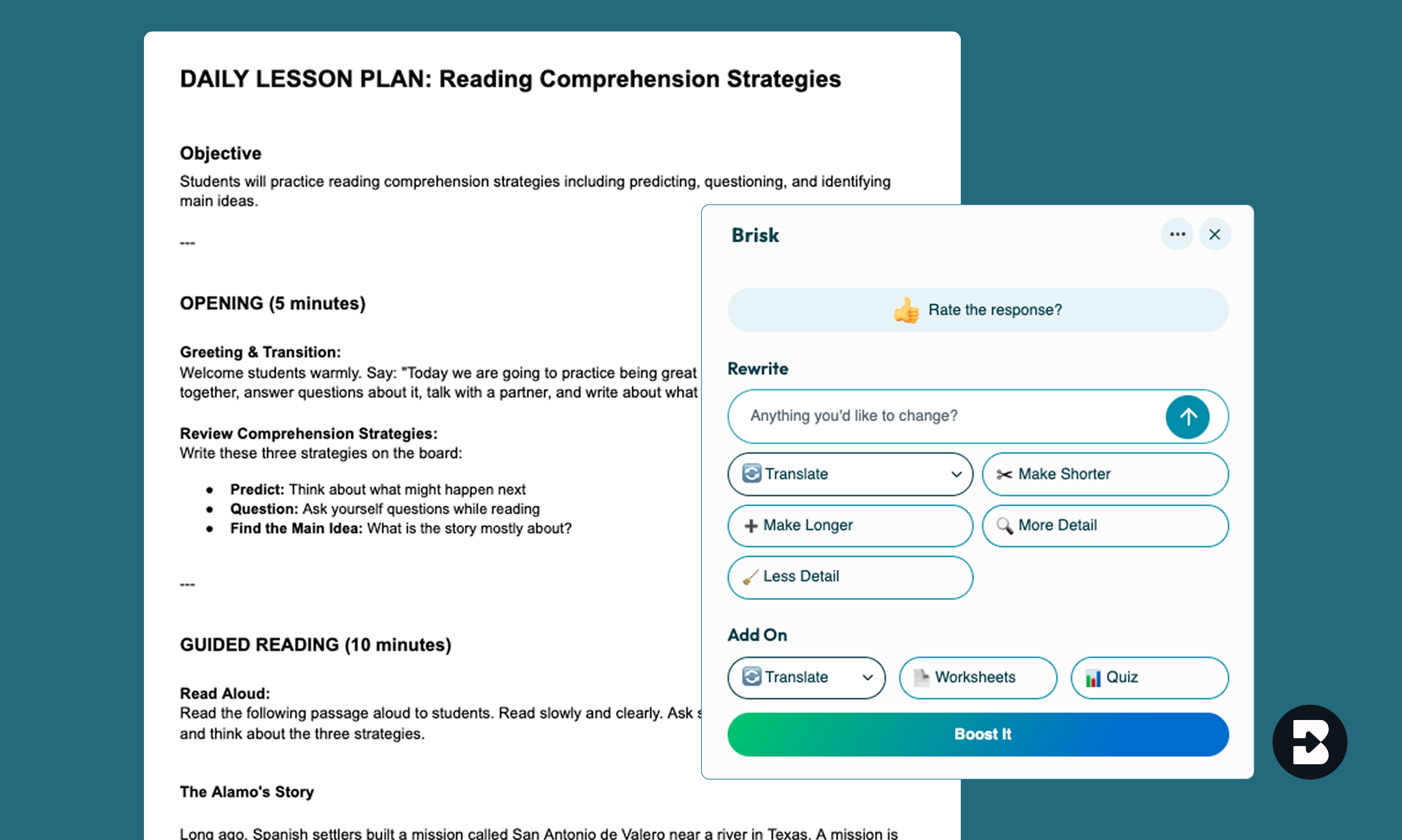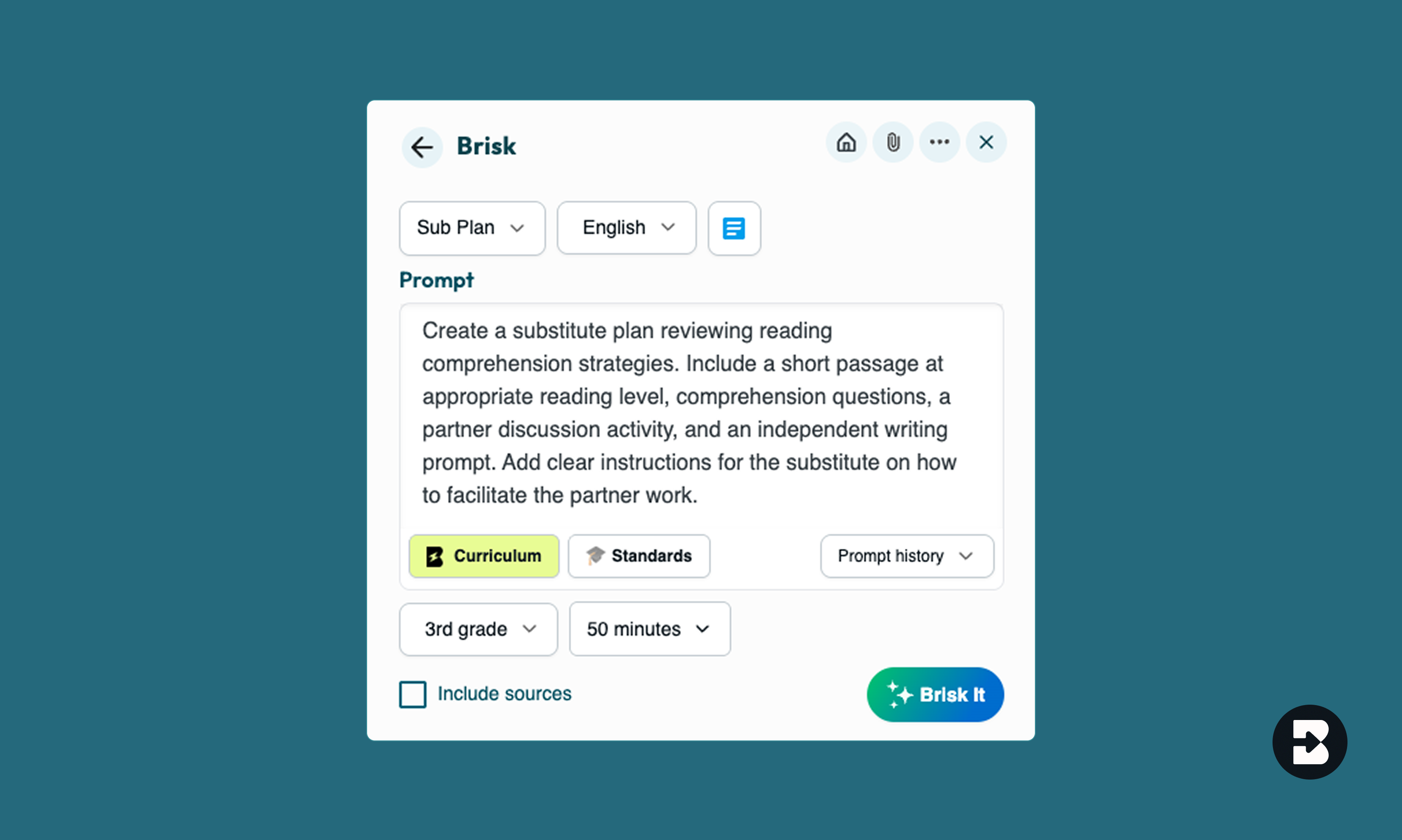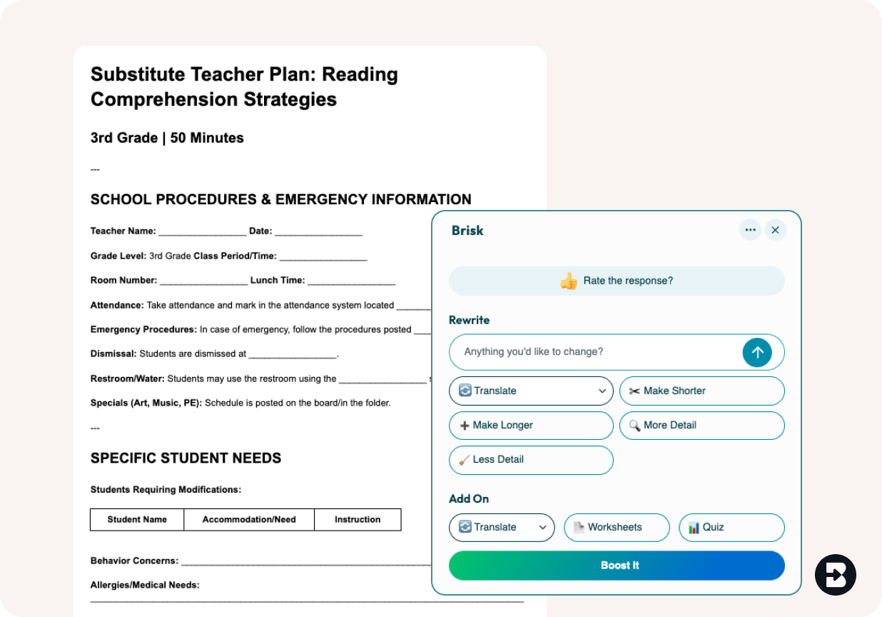 Whether you're planning ahead or need something right now, Brisk creates complete, classroom-ready substitute plans in seconds. No more emergency prep work or generic busy work.