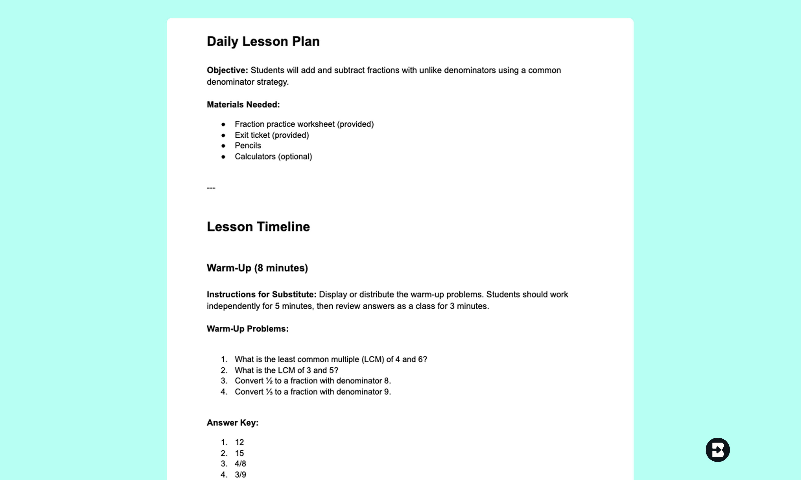 Create a 50-minute sub plan for 7th grade students to practice adding and subtracting fractions with unlike denominators. Include a warm-up review, guided practice problems with step-by-step instructions for the substitute, independent practice, and an exit ticket. Make sure activities are self-explanatory and require minimal teacher intervention.