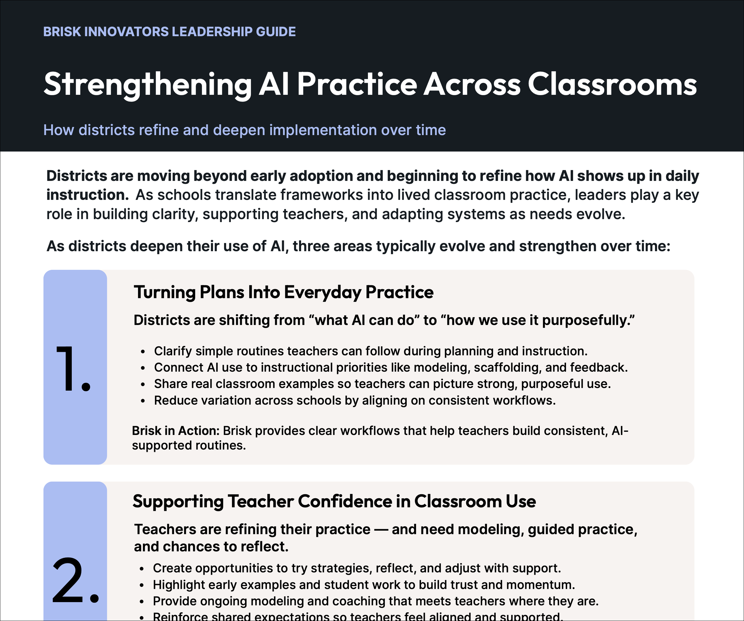 This leadership guide shows how districts build clarity, shared routines, and aligned support so AI becomes a purposeful, consistent part of classroom instruction. Get the free guide sent to your inbox.