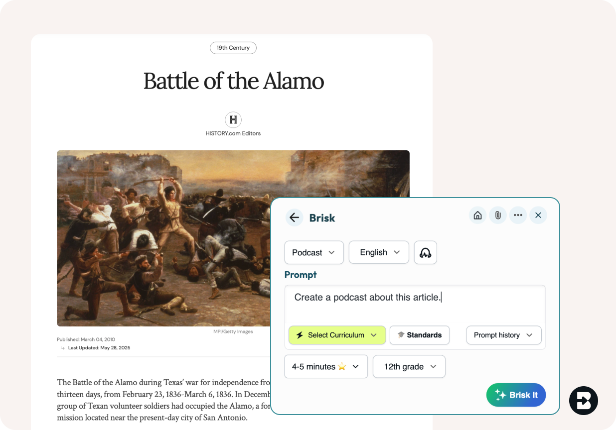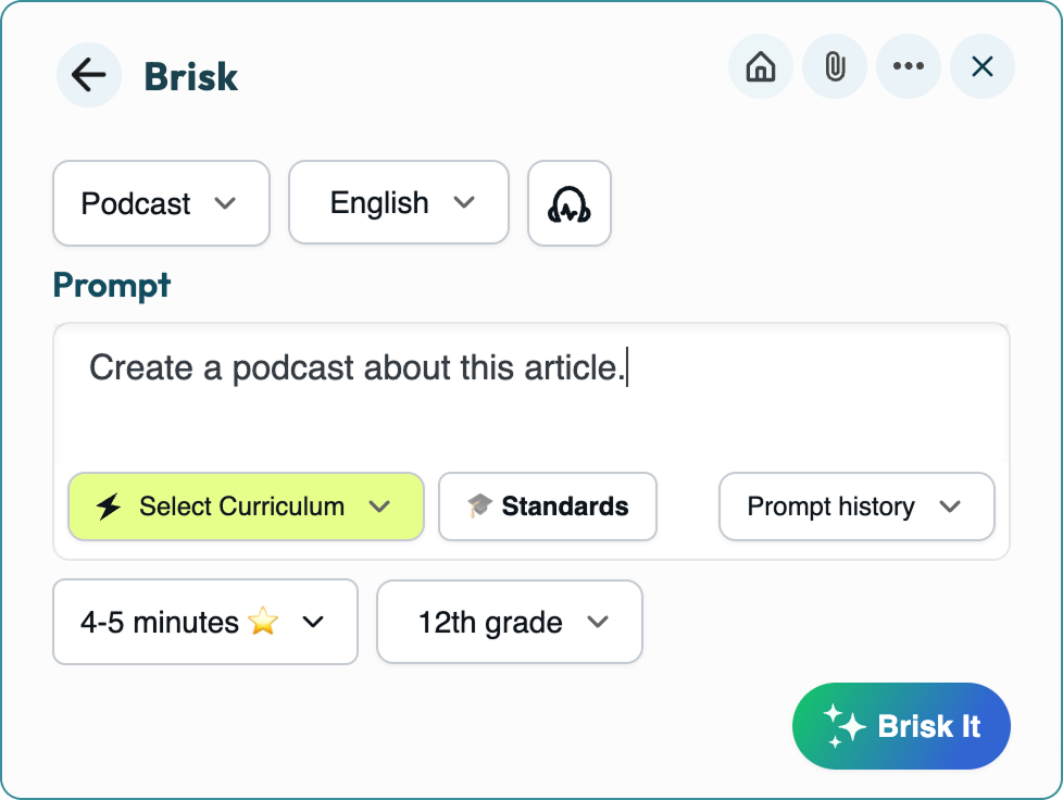 Already have an article, video, or lesson plan? Brisk converts it into a podcast in seconds. Or just describe what you want and Brisk creates the audio from scratch. Works right from wherever you're teaching — no uploads, no new platforms.