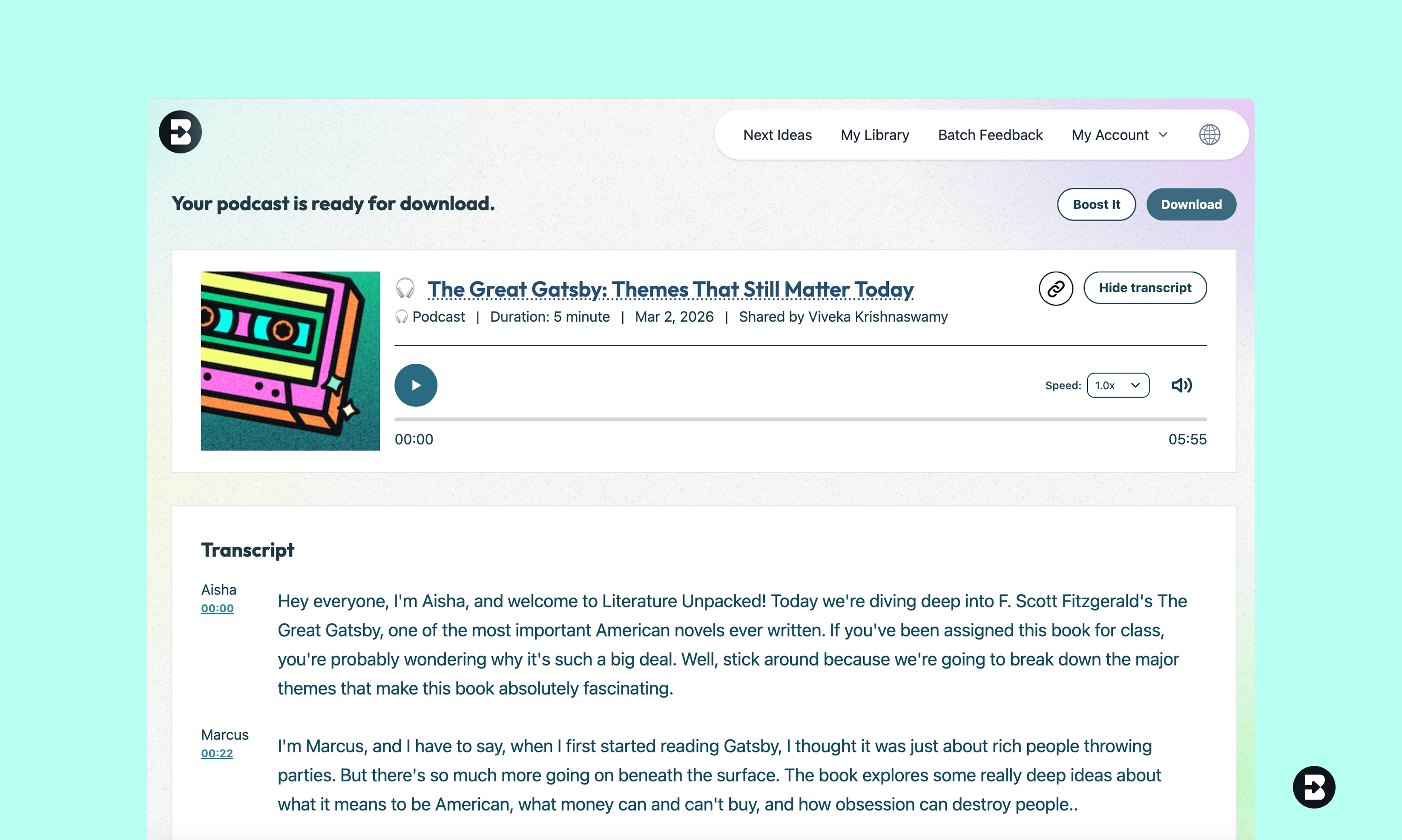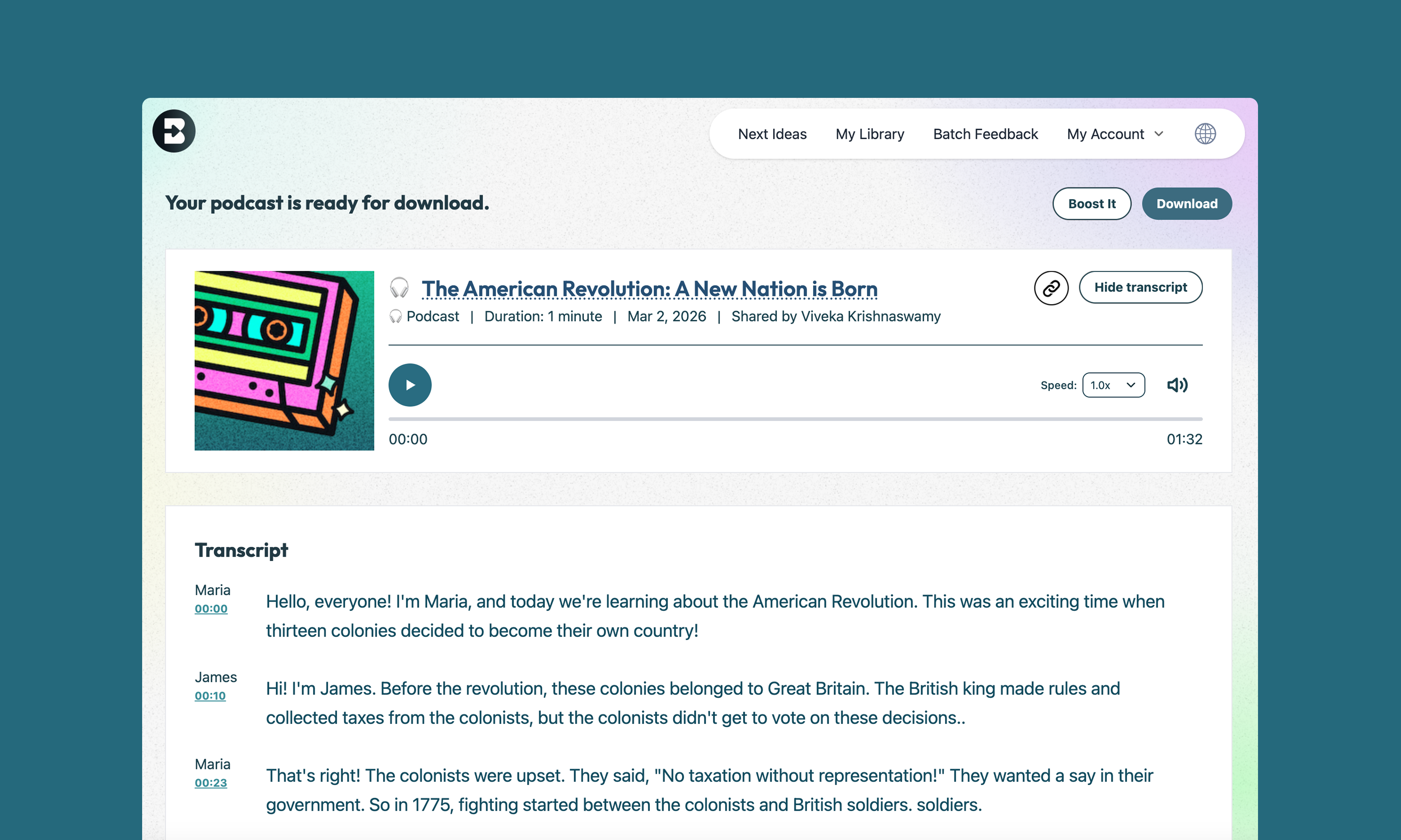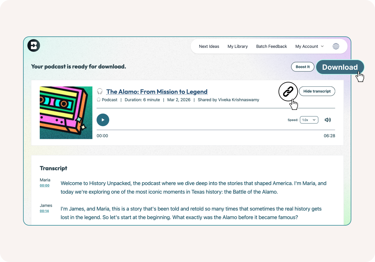 - Optional — Boost it into an activity: Want to turn your podcast into an interactive learning experience? Click "Boost Student Activity" to add discussion questions, reflection prompts, or comprehension checks that students complete alongside the audio.