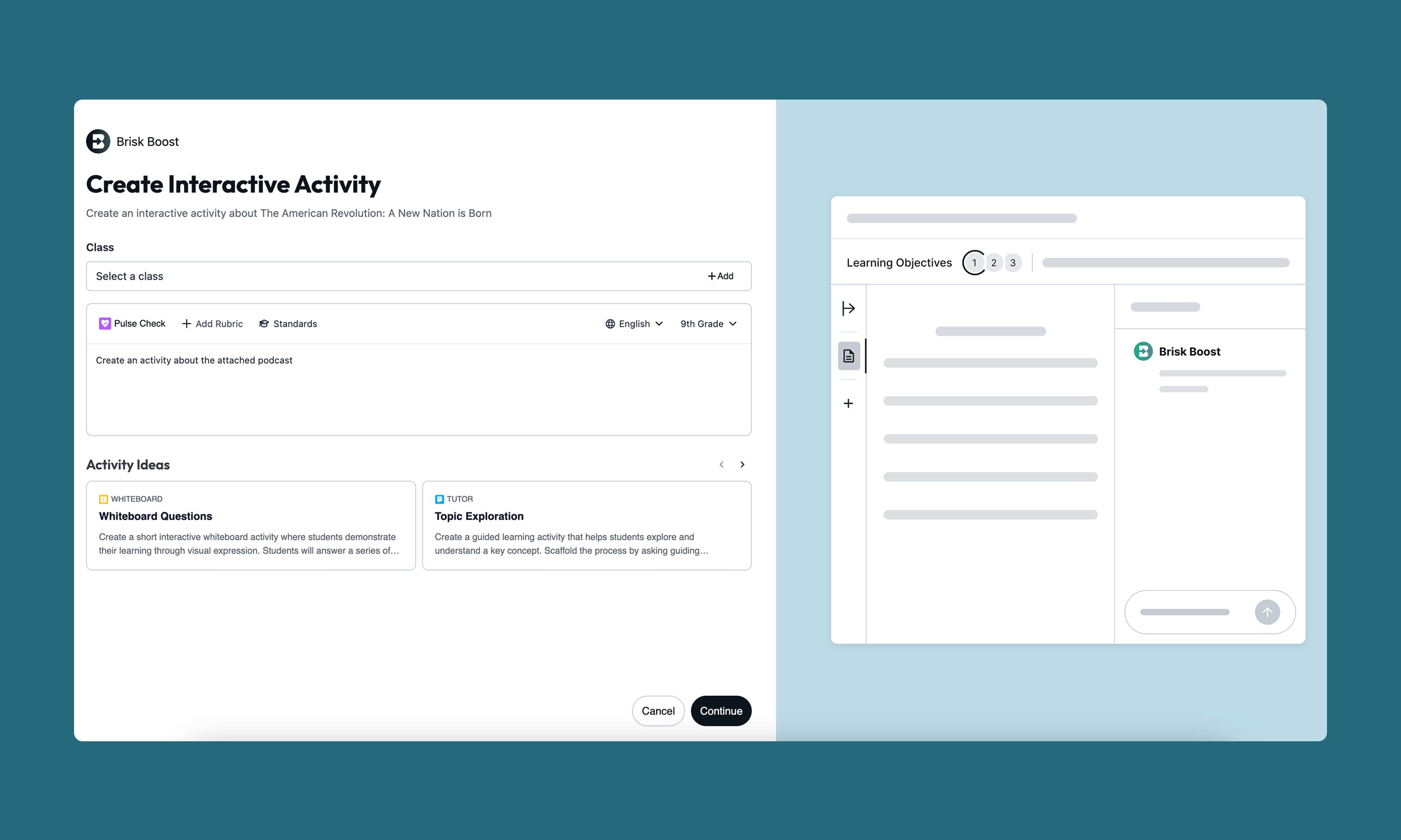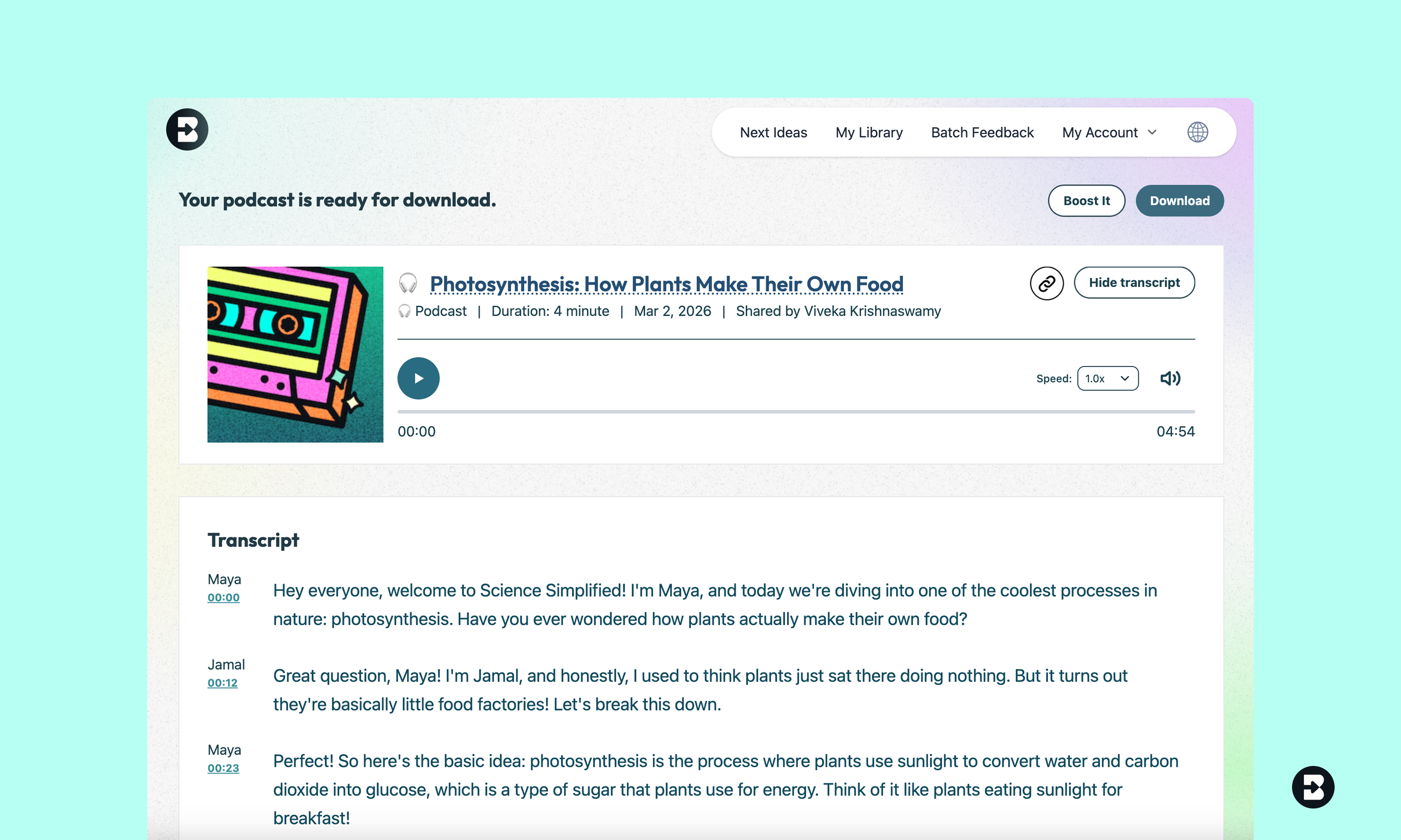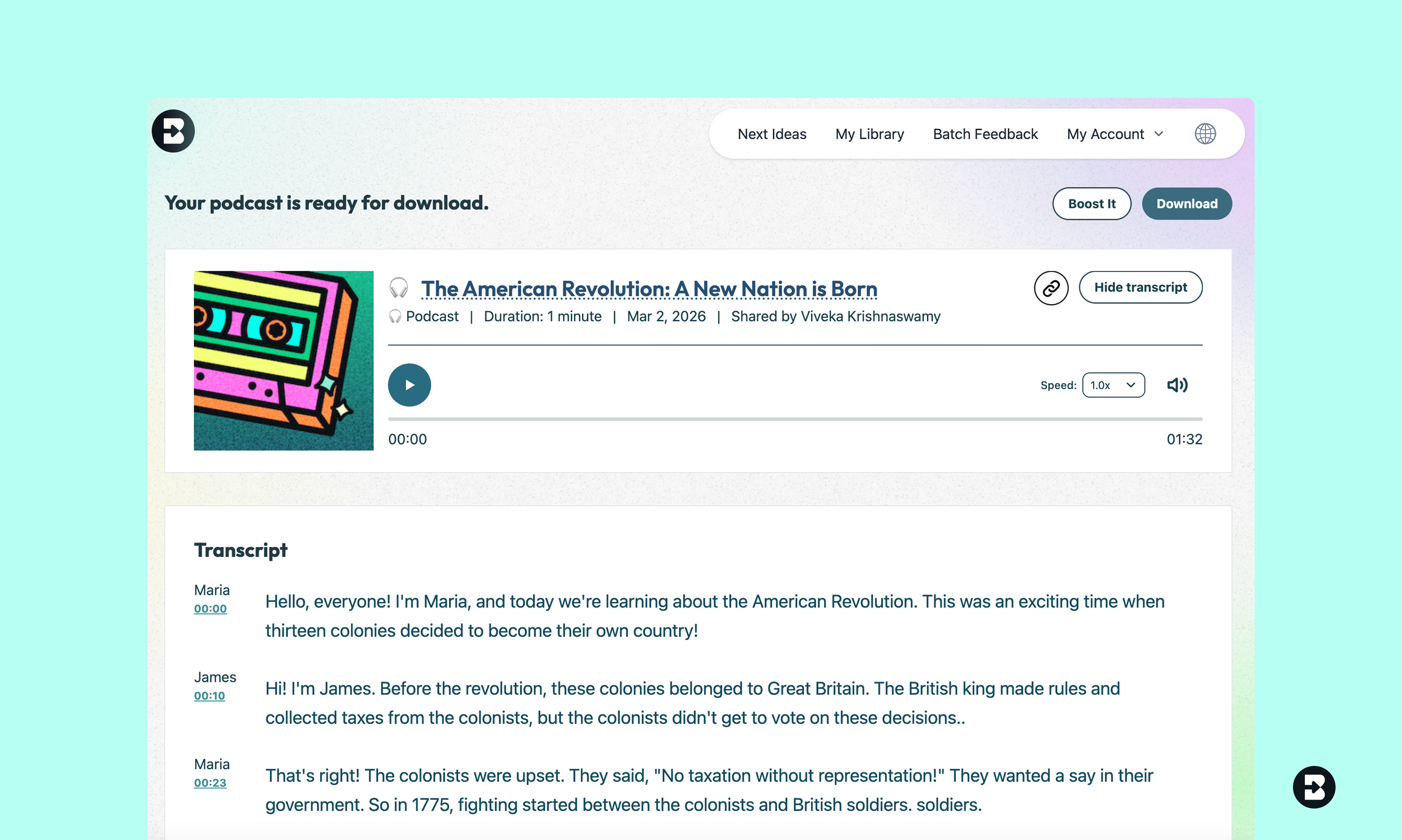 - Optional — Boost it into an activity: Want to turn your podcast into an interactive learning experience? Click "Boost Student Activity" to add discussion questions, reflection prompts, or comprehension checks that students complete alongside the audio.