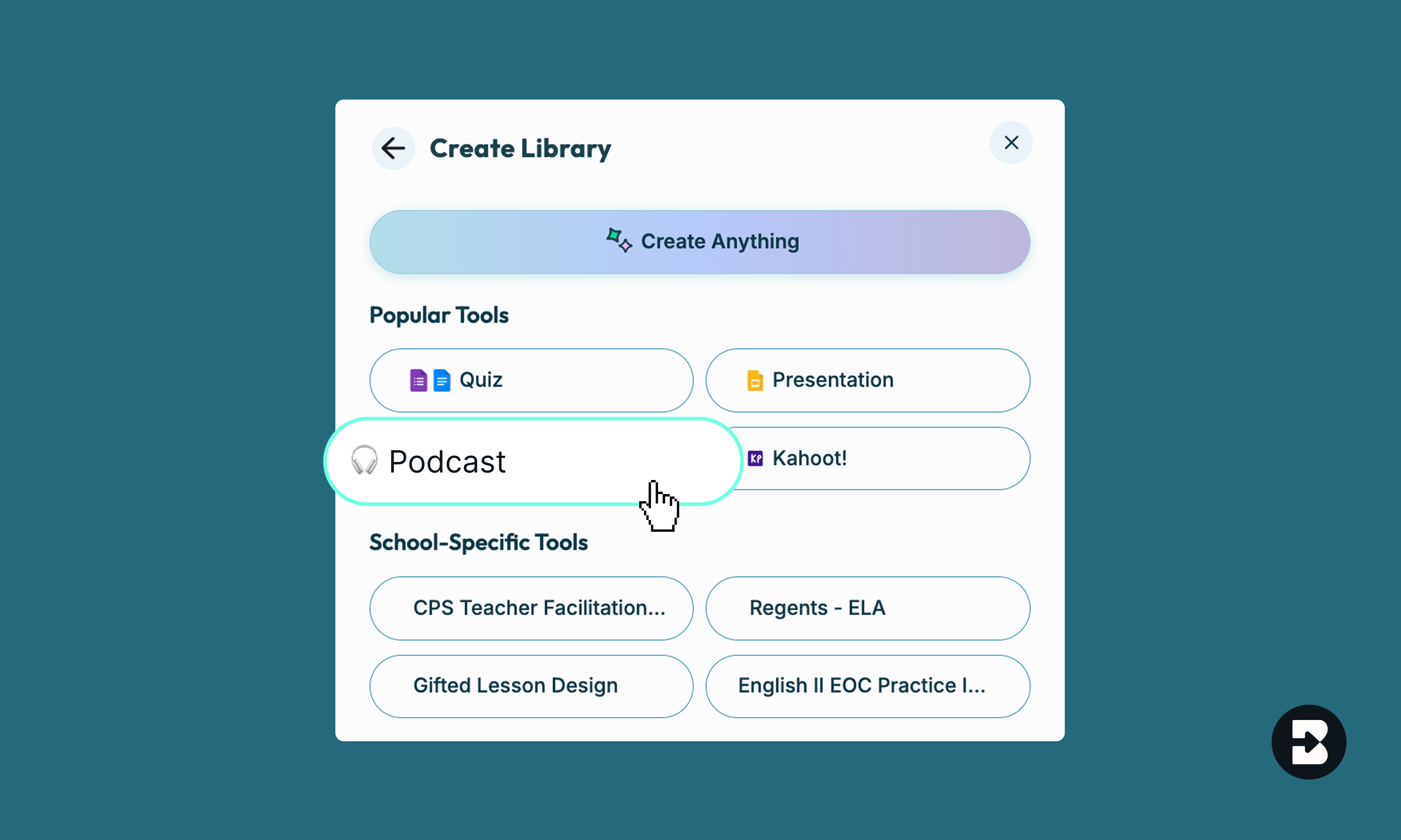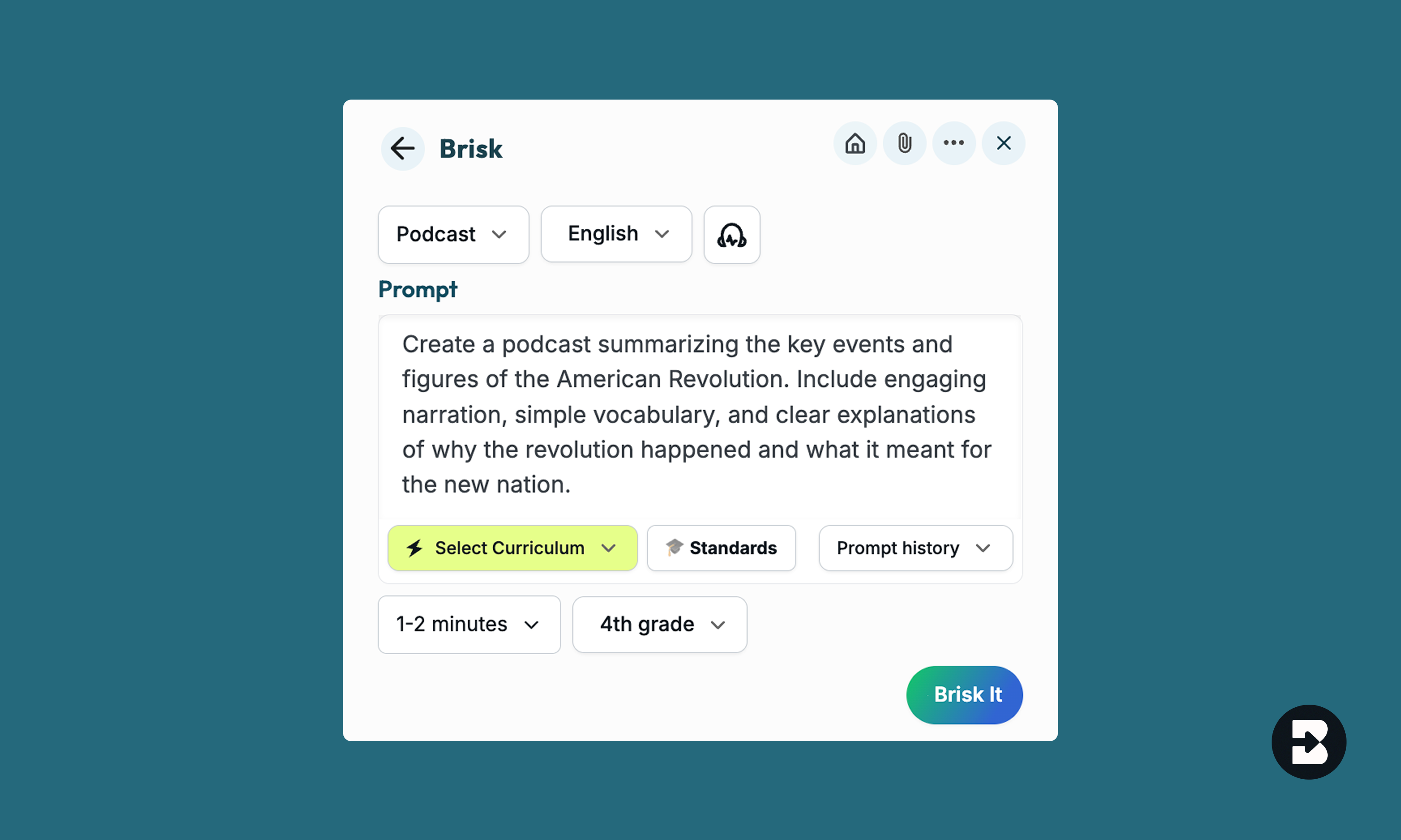 Yes! Once you create a Podcast, click on the Brisk B and select ‘Create.’ From there, you can generate a quiz, inquiry worksheet, or anything you need to supplement your lesson.