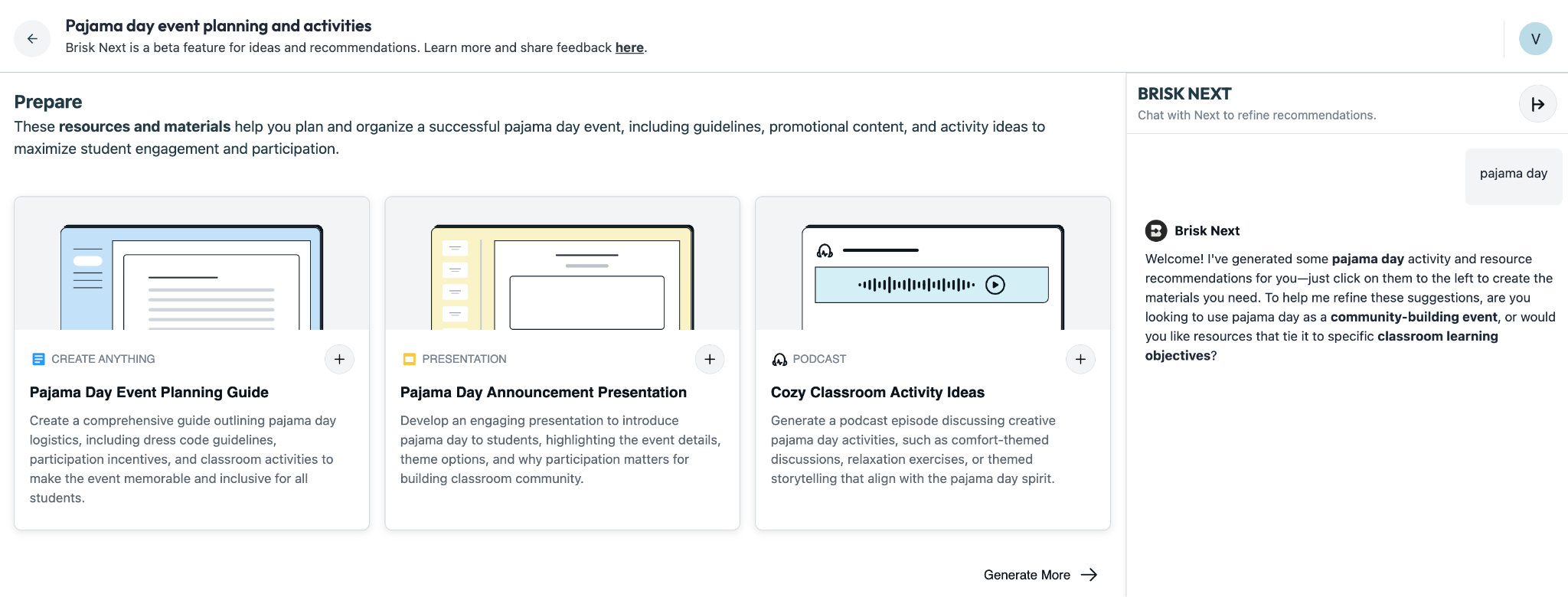 Whether the class energy shifts because of a holiday, a surprise assembly, or a viral moment, Brisk Next helps you stay flexible and student-centered. Recommendations give you immediate ideas, Next Chat helps you adjust them, Bundles keep everything organized, and Assign makes it easy to get materials to students without delay.