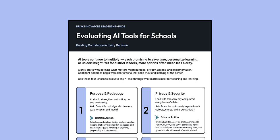Downloadable guides, planning templates, and implementation resources for teachers and district leaders using Brisk.