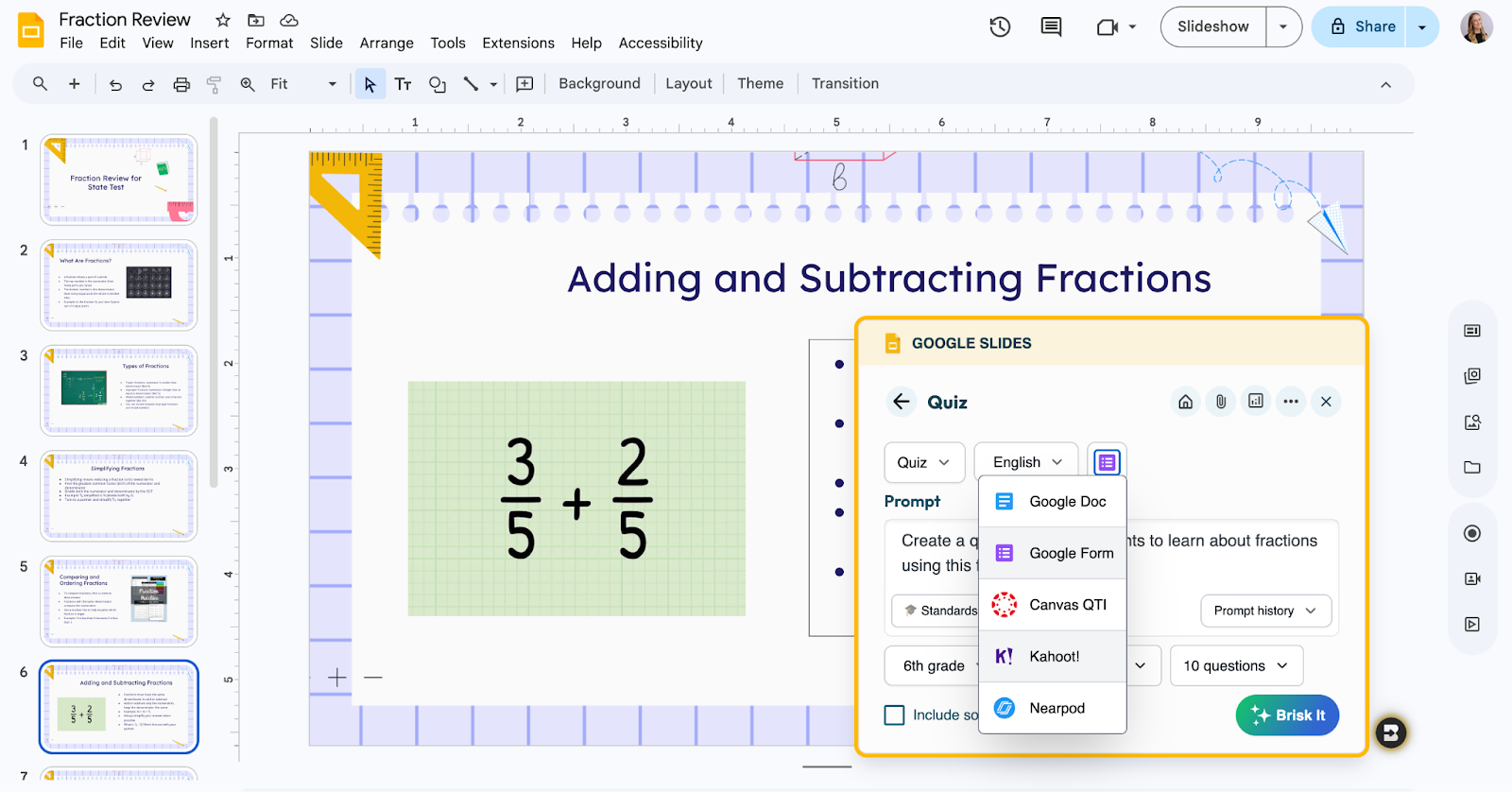Your fractions unit slides are already open. Open Brisk, select Quiz, and choose your output — Google or Microsoft Forms or Docs, Kahoot, Nearpod, Canvas, wherever your students are. Your first period loves competition? Send it to Kahoot. Third period is test-anxious? Push it to Nearpod. Same quiz. Any format. Thirty seconds of work.