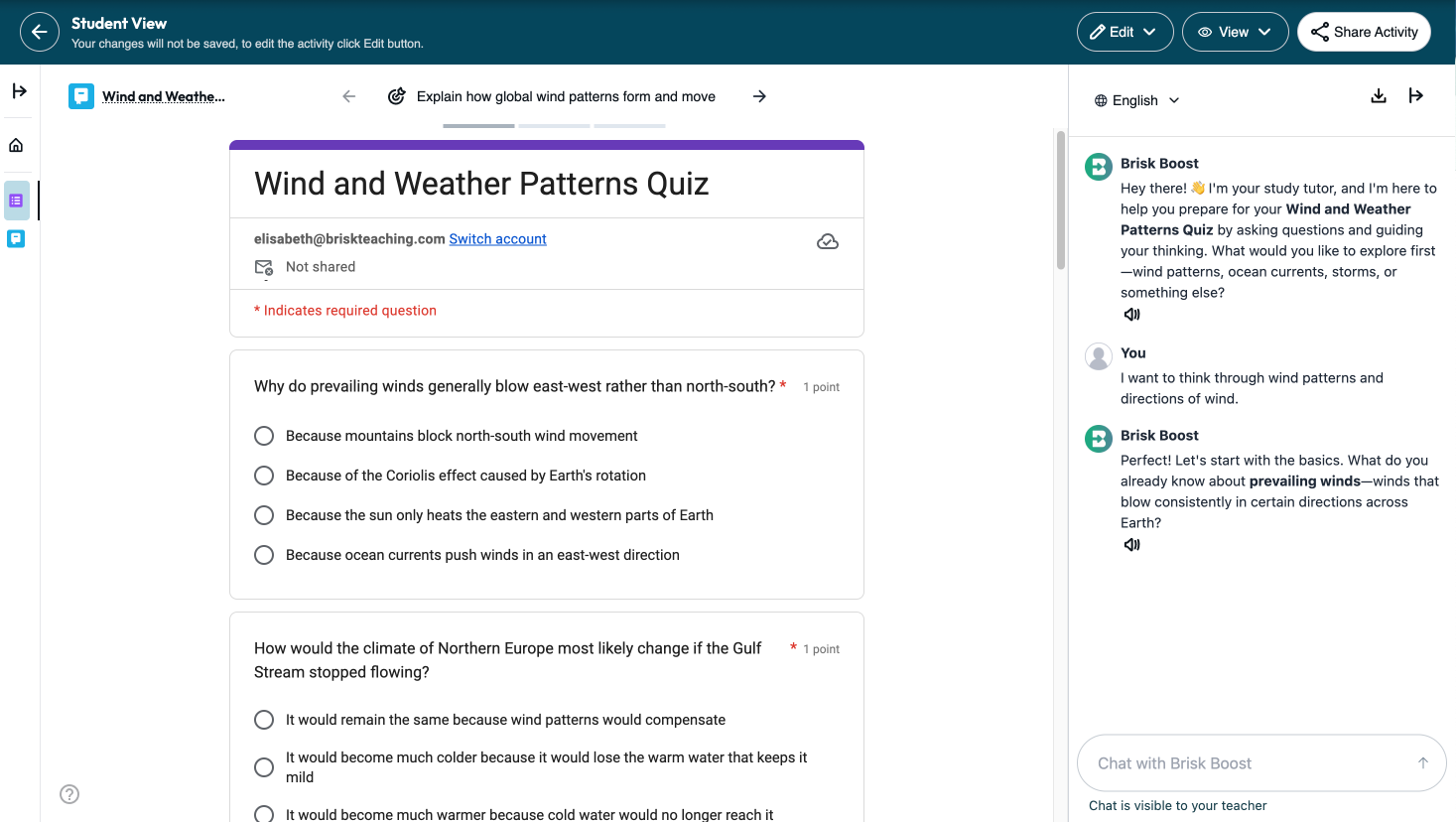 How it works: Once you've generated a quiz, launch it as a Boost Student Activity. Students take the quiz with Brisk Boost open as a chat sidebar. When they're stuck, they can ask for help, and Boost guides them toward the answer through questions and hints, not by handing it over.