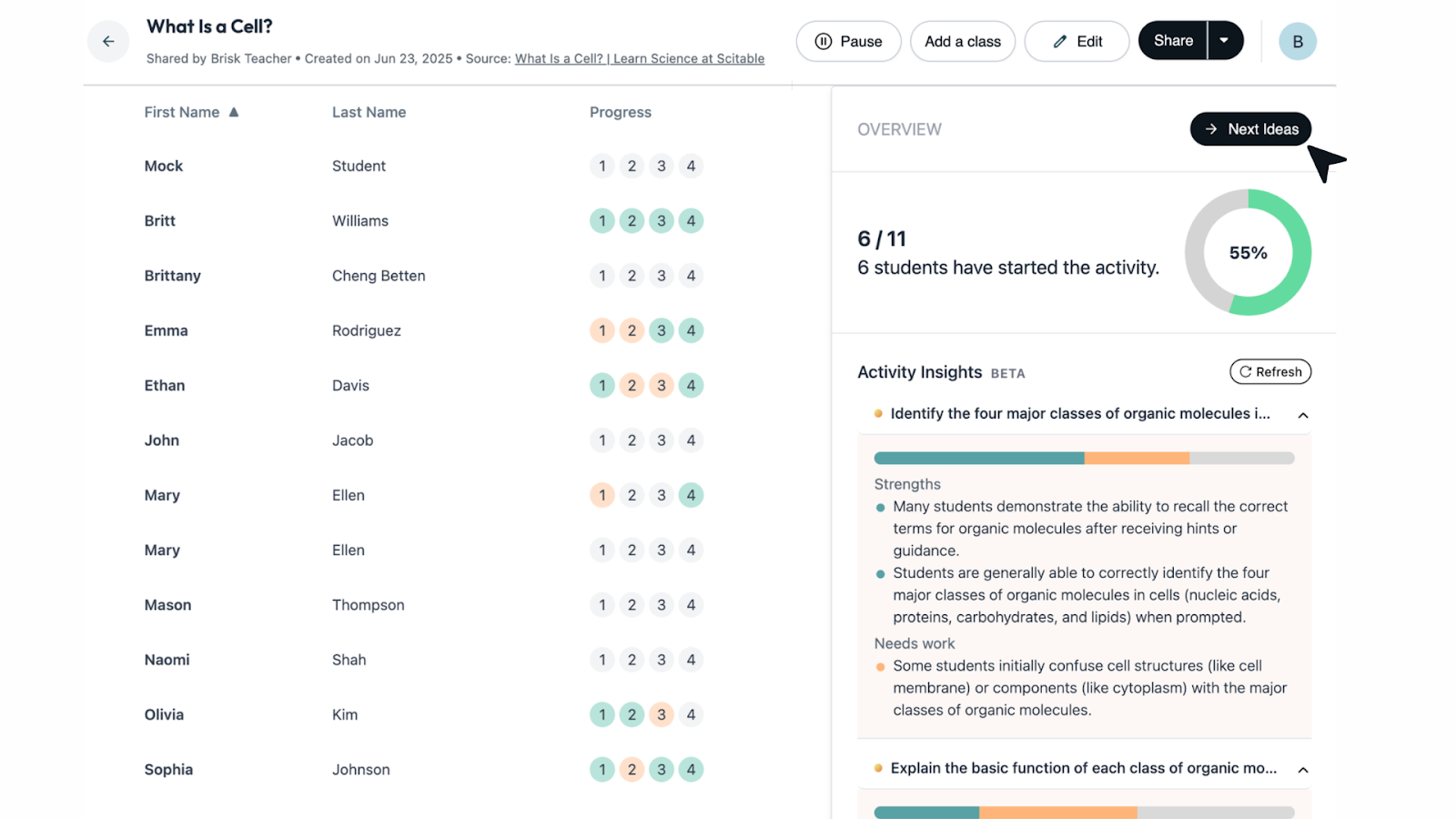 Your class just finished a Boost activity on What Is a Cell. Brisk’s Learning Insights shows 6 of 11 students have completed it. Strengths: most students can identify the four major classes of organic molecules. Needs work: some are still confusing cell structures with organic molecules. Next Ideas is one click away. You walk in tomorrow knowing exactly what to do next.