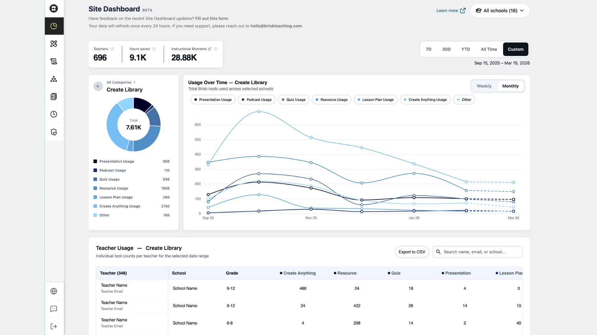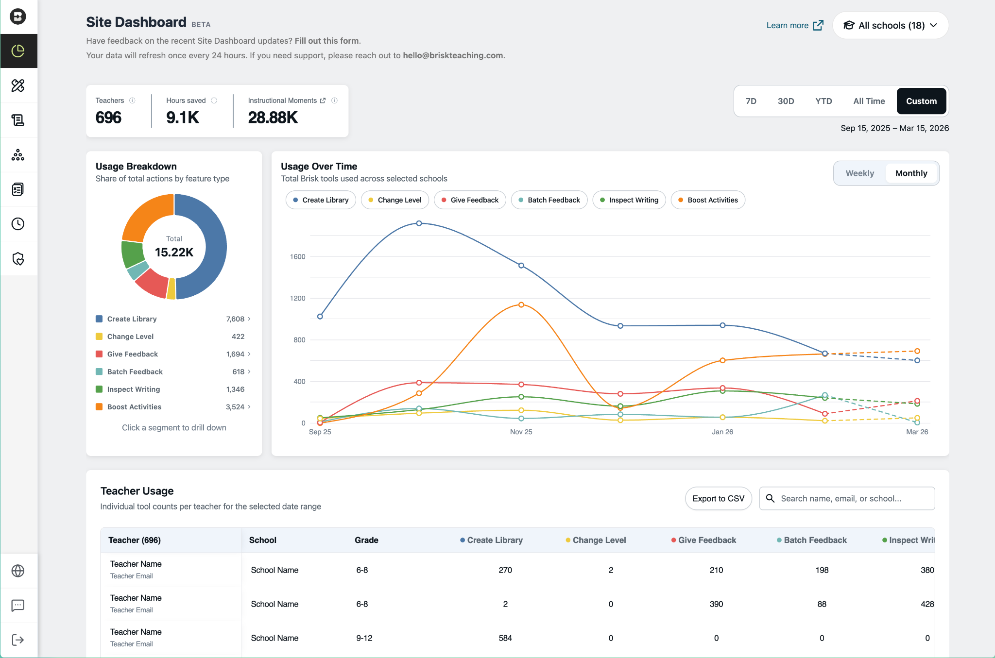 The updated Brisk Site Dashboard gives district administrators visibility into teacher AI usage — by school, by feature, by teacher. Data refreshes nightly.
