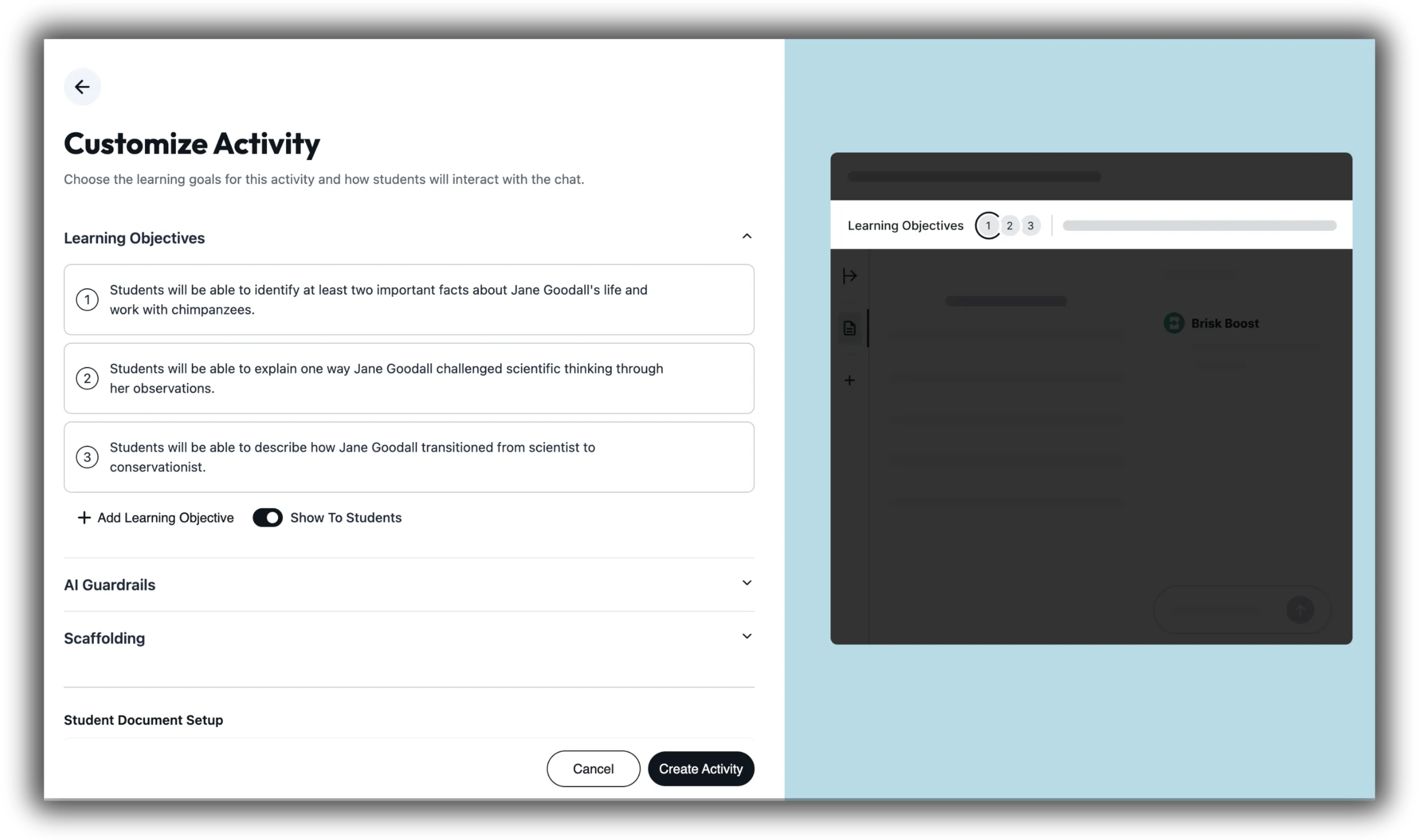 Add or adjust learning objectives, AI Guardrails, and Scaffolding so the activity meets your class’s needs and grade-level standards.