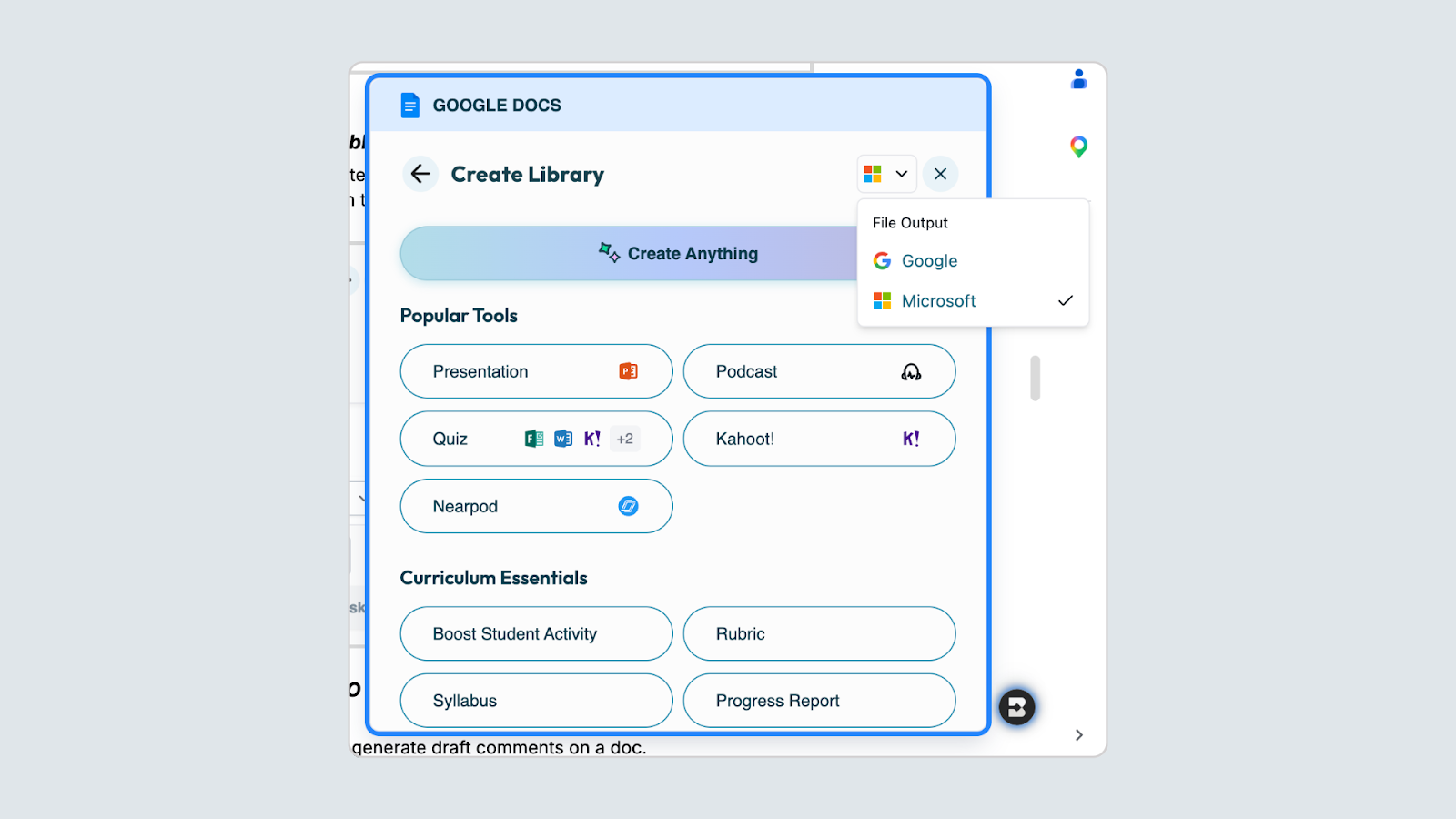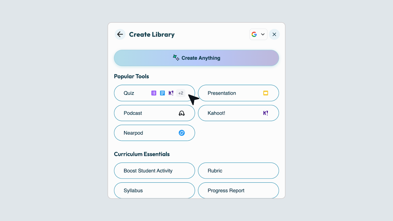 The Create Library now asks you to select your provider — Google or Microsoft — before choosing a tool. Icons and options update automatically based on your selection.