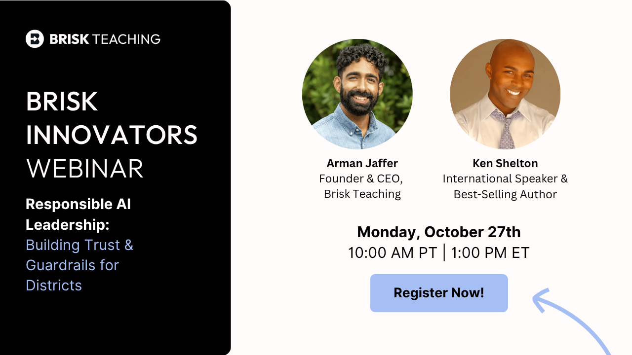 In this Brisk Innovators session, Ken Shelton, a nationally recognized voice on educational leadership and equity, joins Arman Jaffer, Founder & CEO of Brisk Teaching, to share what responsible AI leadership looks like from both district and vendor perspectives. Together, they’ll explore how administrators can establish guardrails, model responsible use, and ensure adoption benefits all learners.