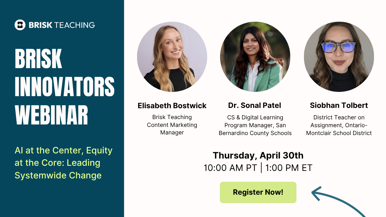 In this Brisk Innovators 2025 finale, Arman Jaffer, Founder & CEO of Brisk Teaching, will be joined by thought leaders to explore the trends shaping AI in 2025 and beyond. Together, they’ll share how schools can stay future-ready, anticipate challenges, and build on what they’ve learned this year to drive innovation with confidence.