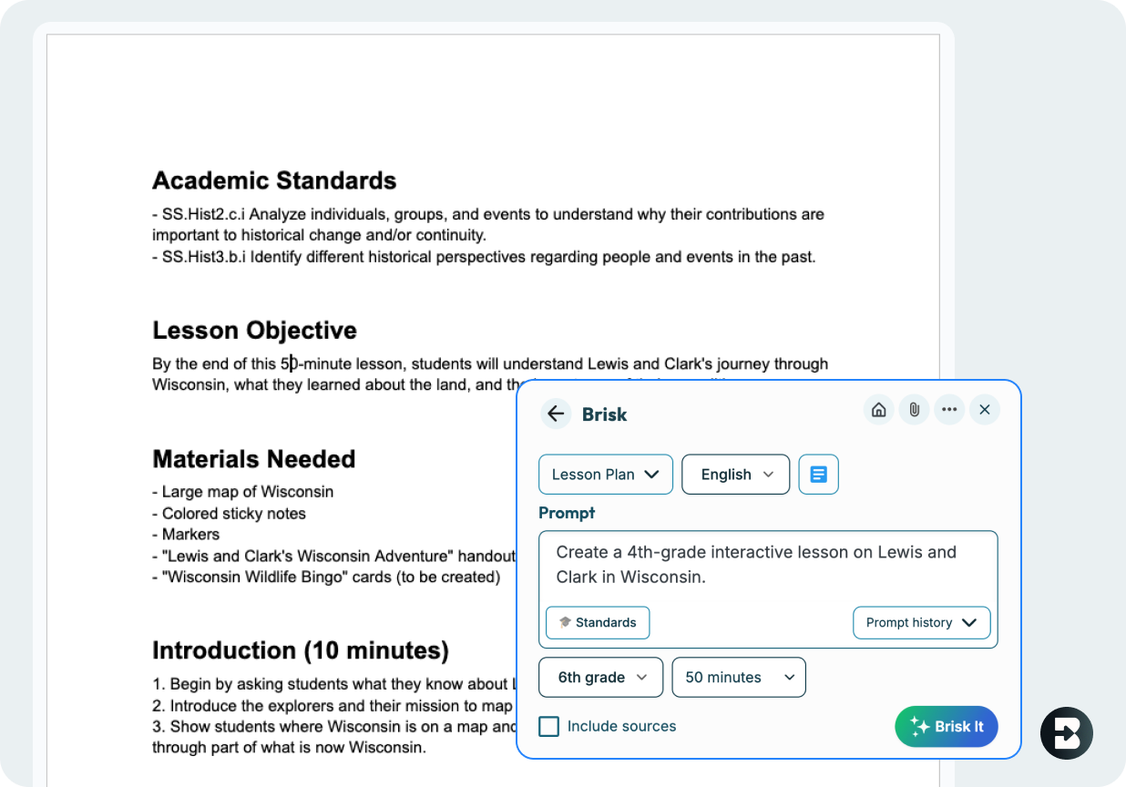 With Brisk's AI-powered lesson plan generator as your classroom helper, you can build student-ready lessons in seconds.