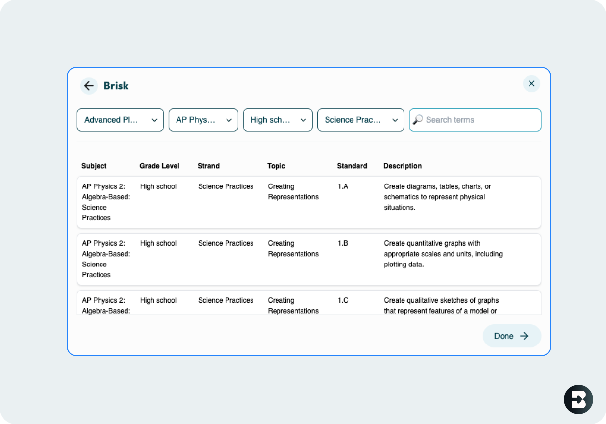 Here’s another amazing time-saver: Select the standards you want to use, and Brisk will apply them to your lesson automatically.